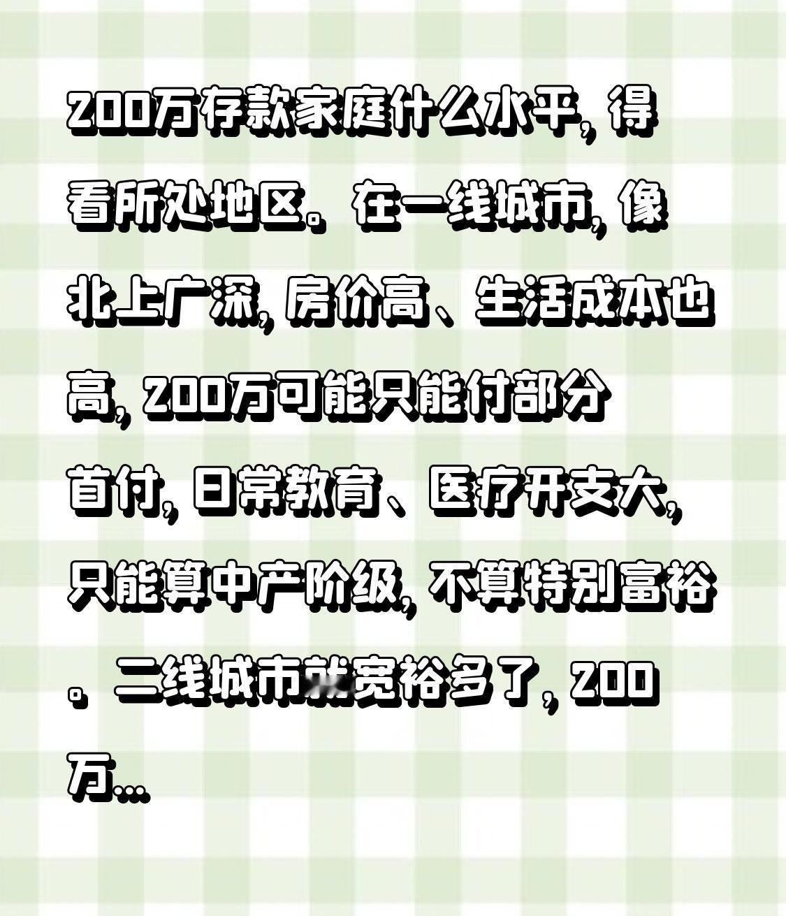 200万存款家庭什么水平,得看所处地区。在一线城市,像北上广深,房价高、生活成本也高,200万可能只能付部分首付,日常教育、医疗开支大,只能算中产阶级,不算特别富裕。