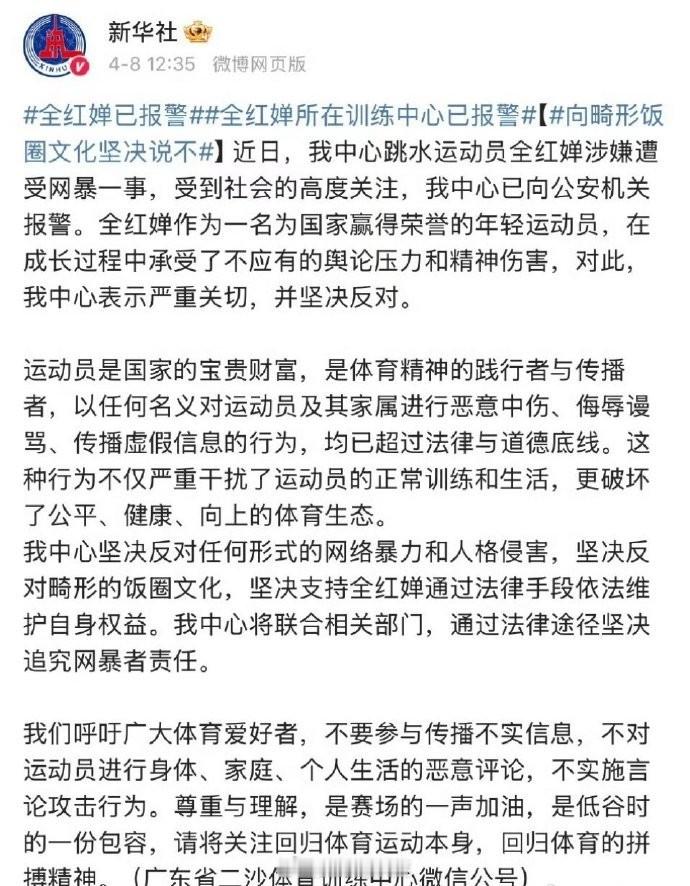全红婵已报警 到底那些人在网暴全红婵?残酷的现实:当你风光无限时,那些对你羡慕嫉妒恨的人,一定会在你低潮时一并发泄给你🤣游泳中心就全红婵遭网暴发声依法坚决抵制畸形饭圈文化
