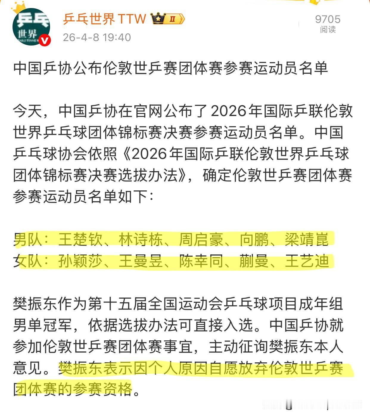 阵容上来说,梁靖崑是男队第五人,樊振东因个人原因自愿放弃参赛。