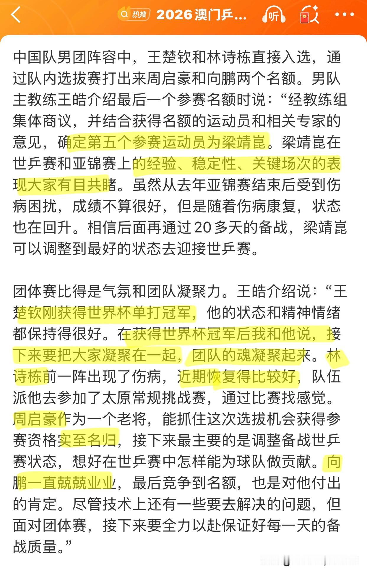 男队,王皓给王楚钦说要把大家凝聚起来,