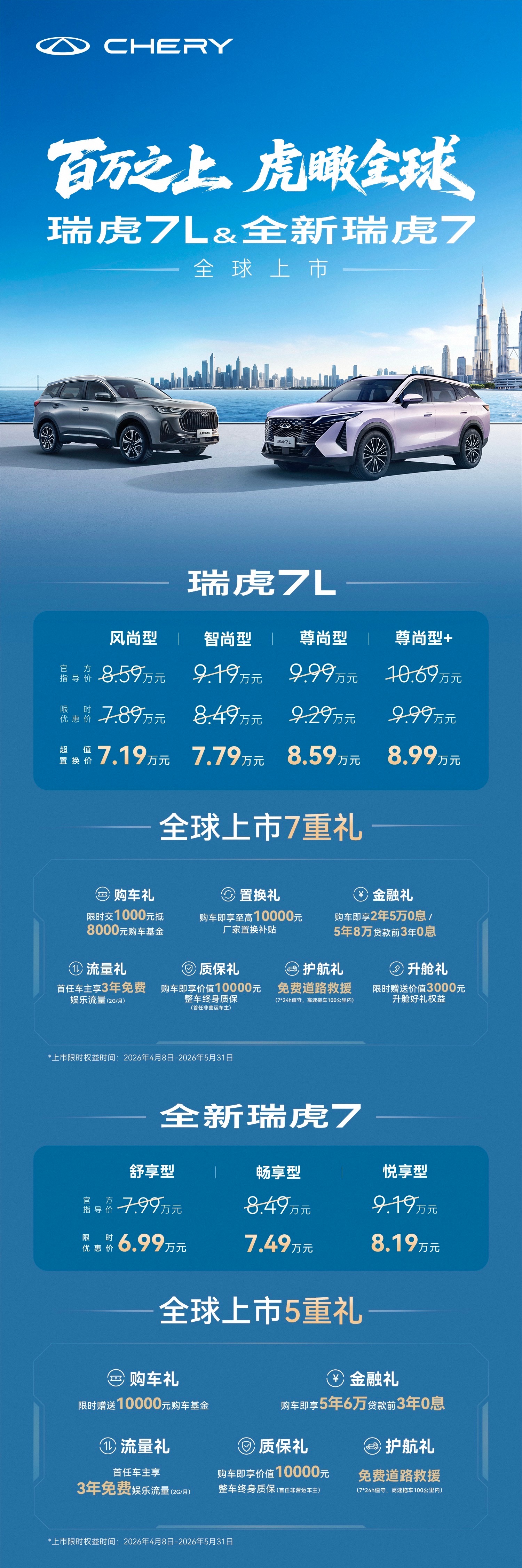 全新瑞虎7直接落到6.99万起,瑞虎7L 8.59万起,但这不是那种6万多能买到