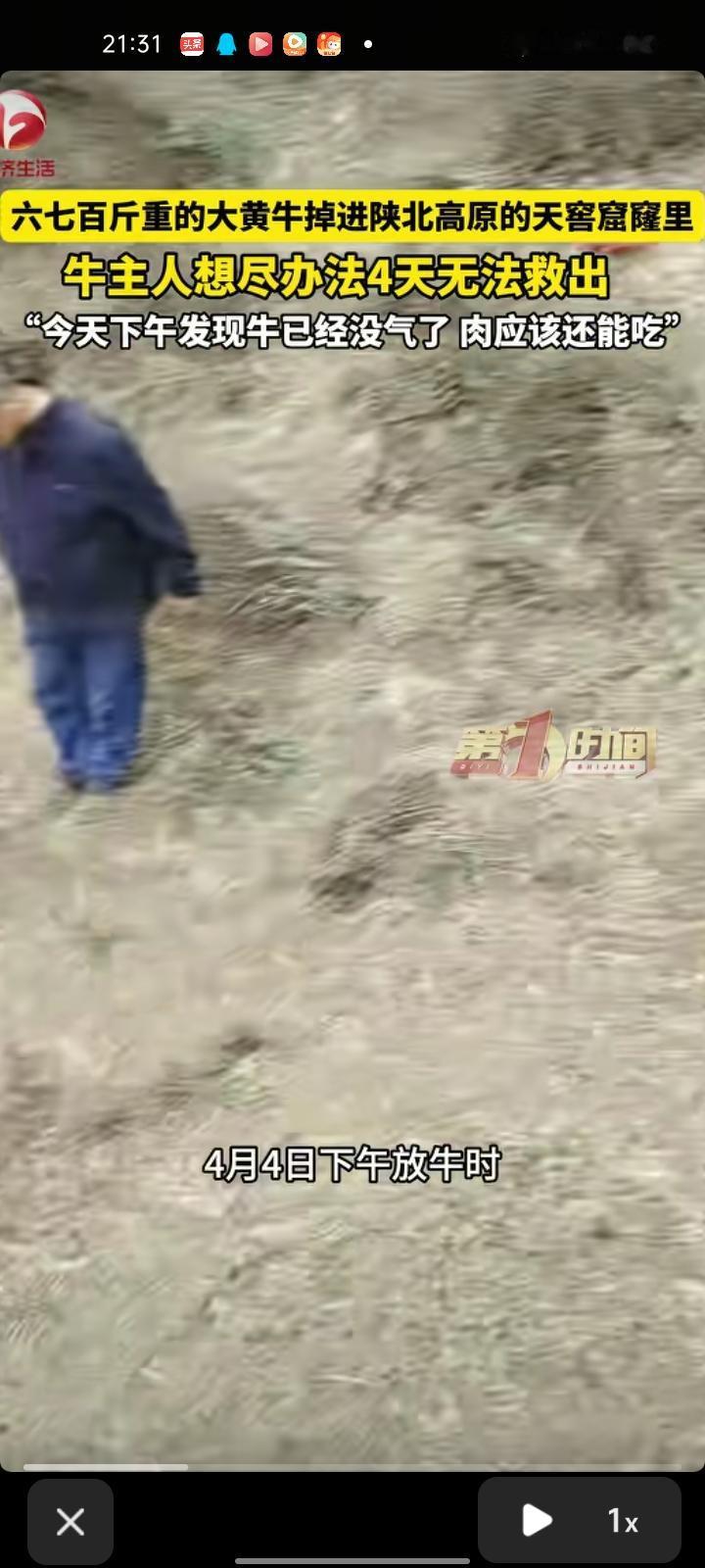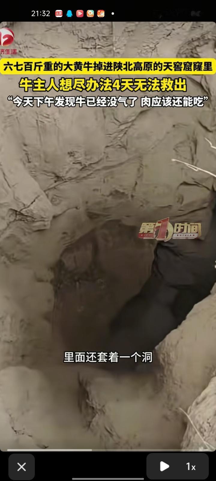 4月6日,榆林市清涧县。六七百斤重的大黄牛掉进陕北高原的天窖窟窿里,牛主人想尽办法,四天都没有救出来。