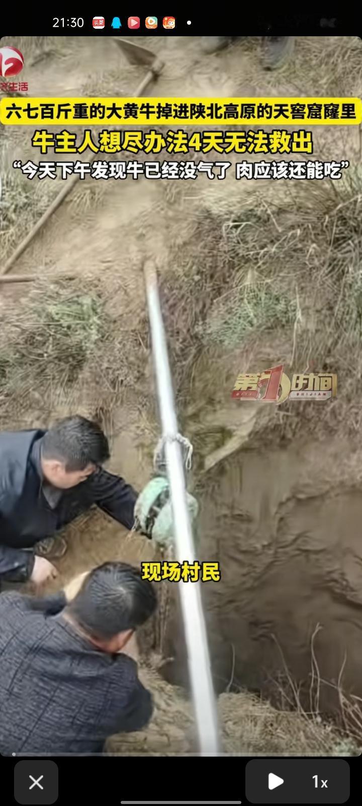 4月6日,榆林市清涧县。六七百斤重的大黄牛掉进陕北高原的天窖窟窿里,牛主人想尽办