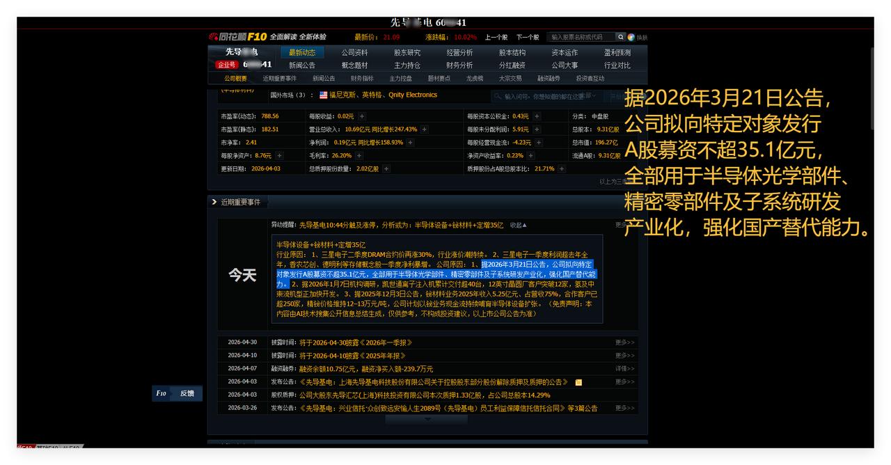 据2026年3月21日公告,公司拟向特定对象发行A股募资不超35.1亿元,全部用于半导体光学部件、精密零部件及子系统研发产业化,强化国产替代能力。敬请参阅附图2。