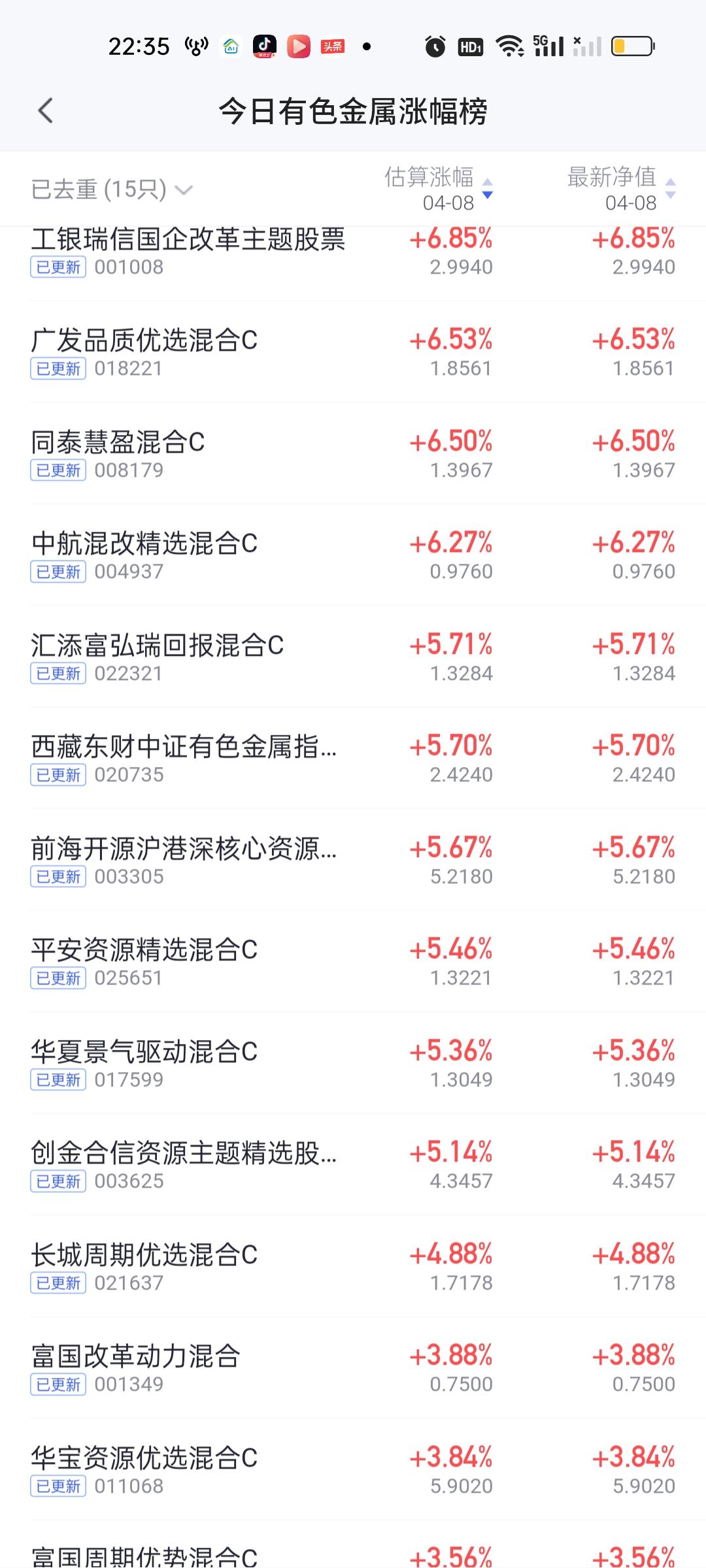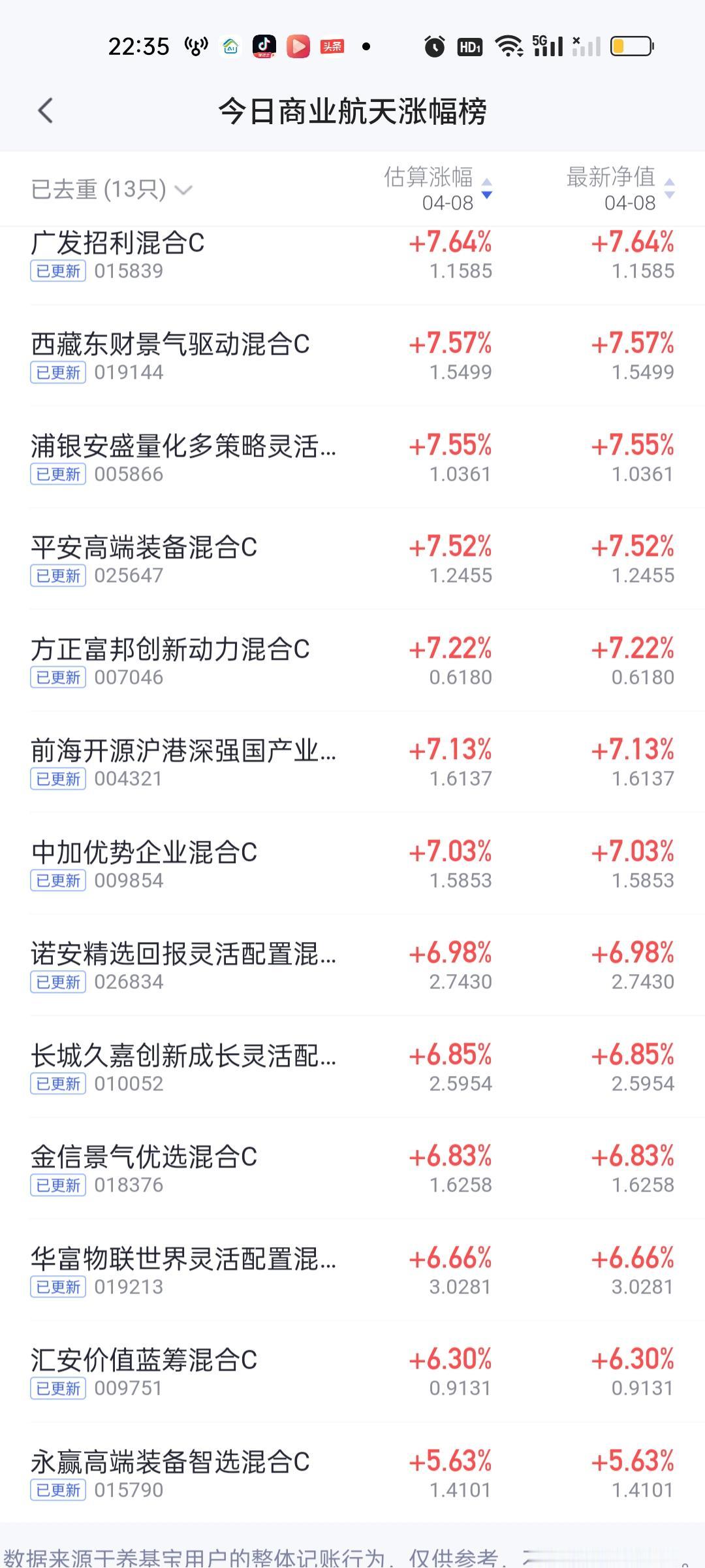 今日基金净值榜已全部更新完毕。前100名的基金涨幅都在7.60%以上,前1000名都在5%以上,可见今天赚钱效应有多强。