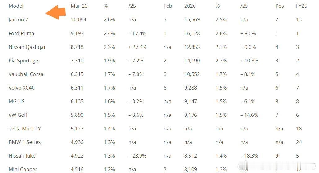 万万想不到,奇瑞这回竟然牛逼到英国去了。谁能想到,一款中国车型能在英国市场独占鳌头,成为销冠?那可是欧洲发达国家呀,但是奇瑞竟然做到了!3月份,奇瑞探索者06一款车,在海外叫捷酷J7,在英国的月销量竟然高达一万零六十四辆,都是实打实的上牌量,超过福特起亚等传统畅销车,笑傲群雄成为销冠,一举封神。英国才7000多万人口,一款车月销1万,相当于在中国月销20万,这是多么恐怖的水平?更不可思议的是,这距离奇瑞登陆英国市场还不到两年。这款车在中国月销也就几百,在英国竟然能上万,难道就是因为他酷似库里南的瀑布前脸,实现了点石成金的神奇效果?