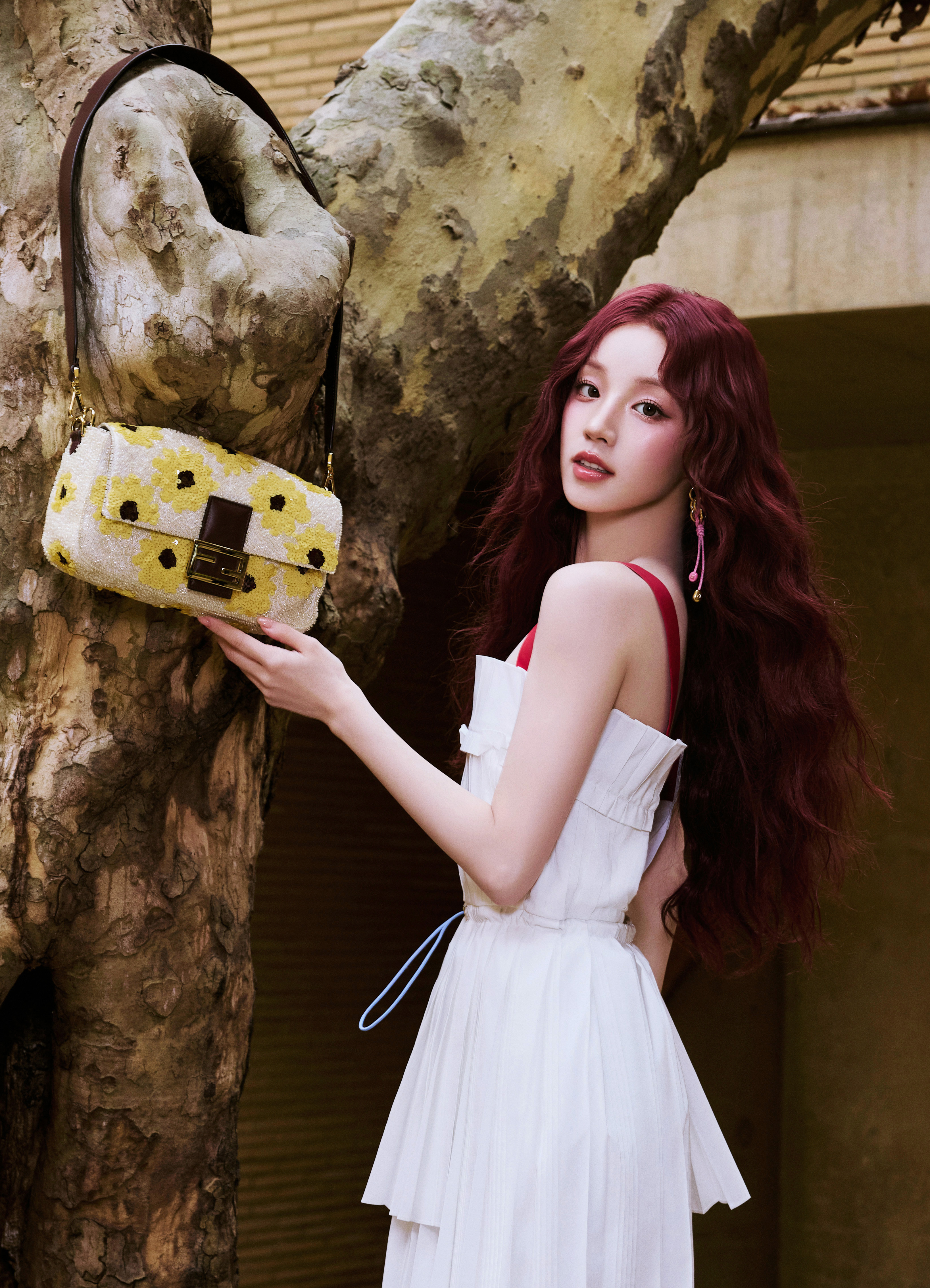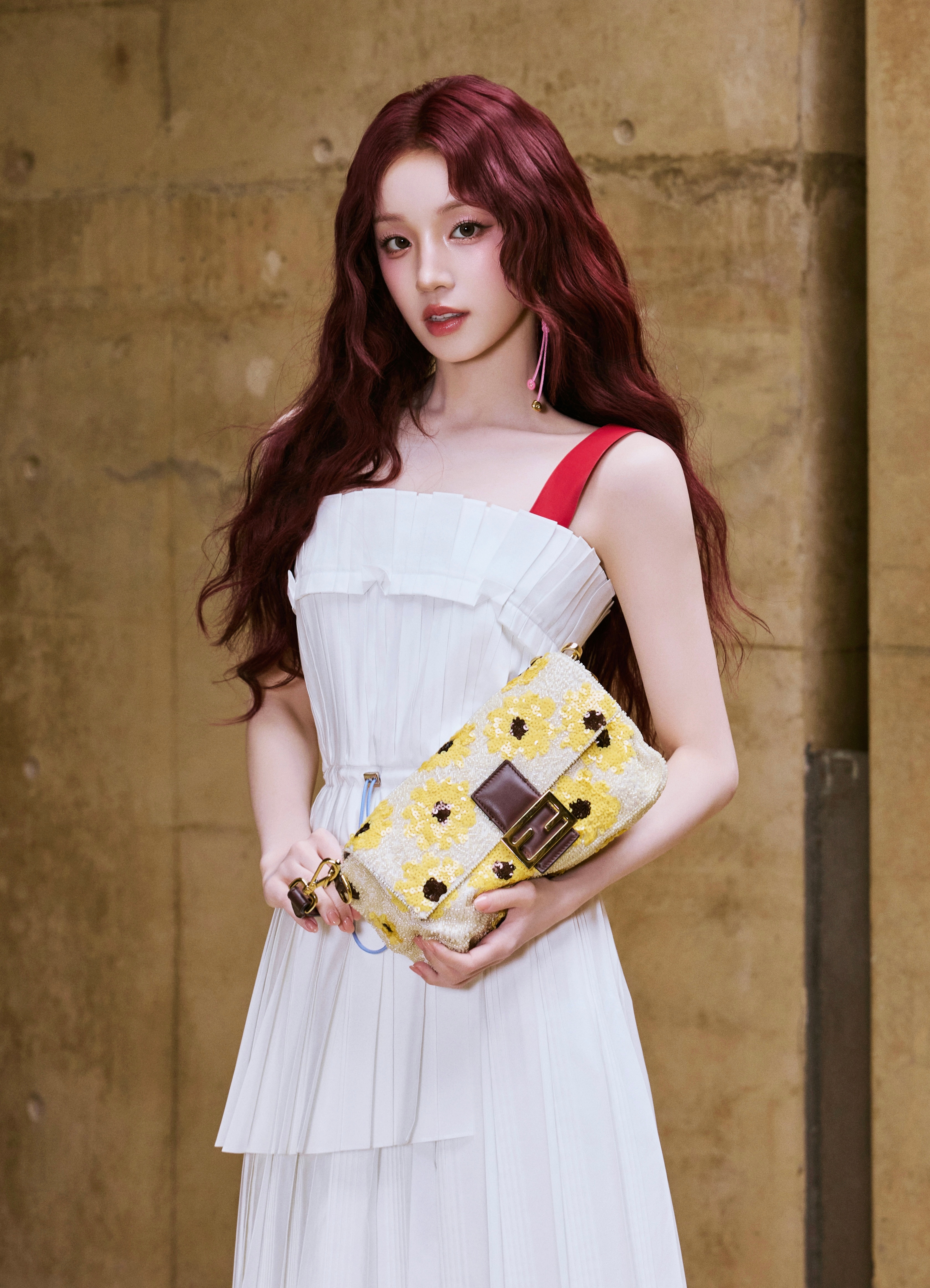 Fendi品牌大使宋雨琦身穿白色长裙搭配红色卷发出席品牌景德镇活动,明媚眼妆搭配