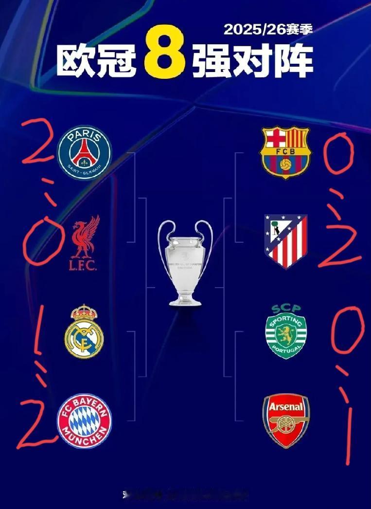 1/4决赛首轮比赛战罢,半决赛对阵呼之欲出:阿森纳vs马竞,拜仁vs大巴黎。比赛结果越来越朝着阿森纳夺冠的方向发展了!!!