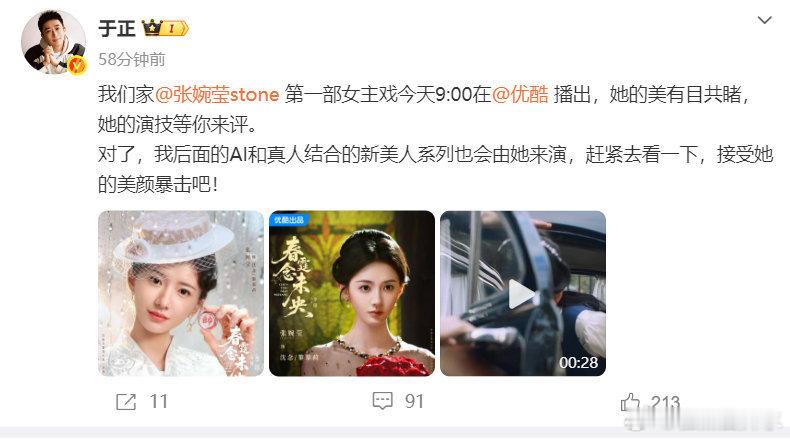 来看娱乐于正发文支持张婉莹新剧于正发了张婉莹首部女主戏张婉莹首部女主剧终于开播,