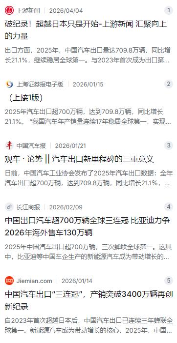 说起来,中国汽车这几年确实憋着一股劲在往前冲。2025年全年,中国汽车出口量达到了709.8万辆,同比增长21.1%,这个数字稳稳地拿下了全球第一。要知道,自从2023年首次超过日本以后,中国已经连续三年把“全球汽车出口冠军”的帽子戴得牢牢的。还有更让人振奋的,按照海关的口径统计,2025年中国出口的汽车总量高达832万辆,算下来全球每卖出去3辆车,就有一辆贴着中国制造标签。什么概念呢?就是你在任何一个国家的任何一个港口,随手一指,那艘滚装船上大概率装的是咱中国的车。