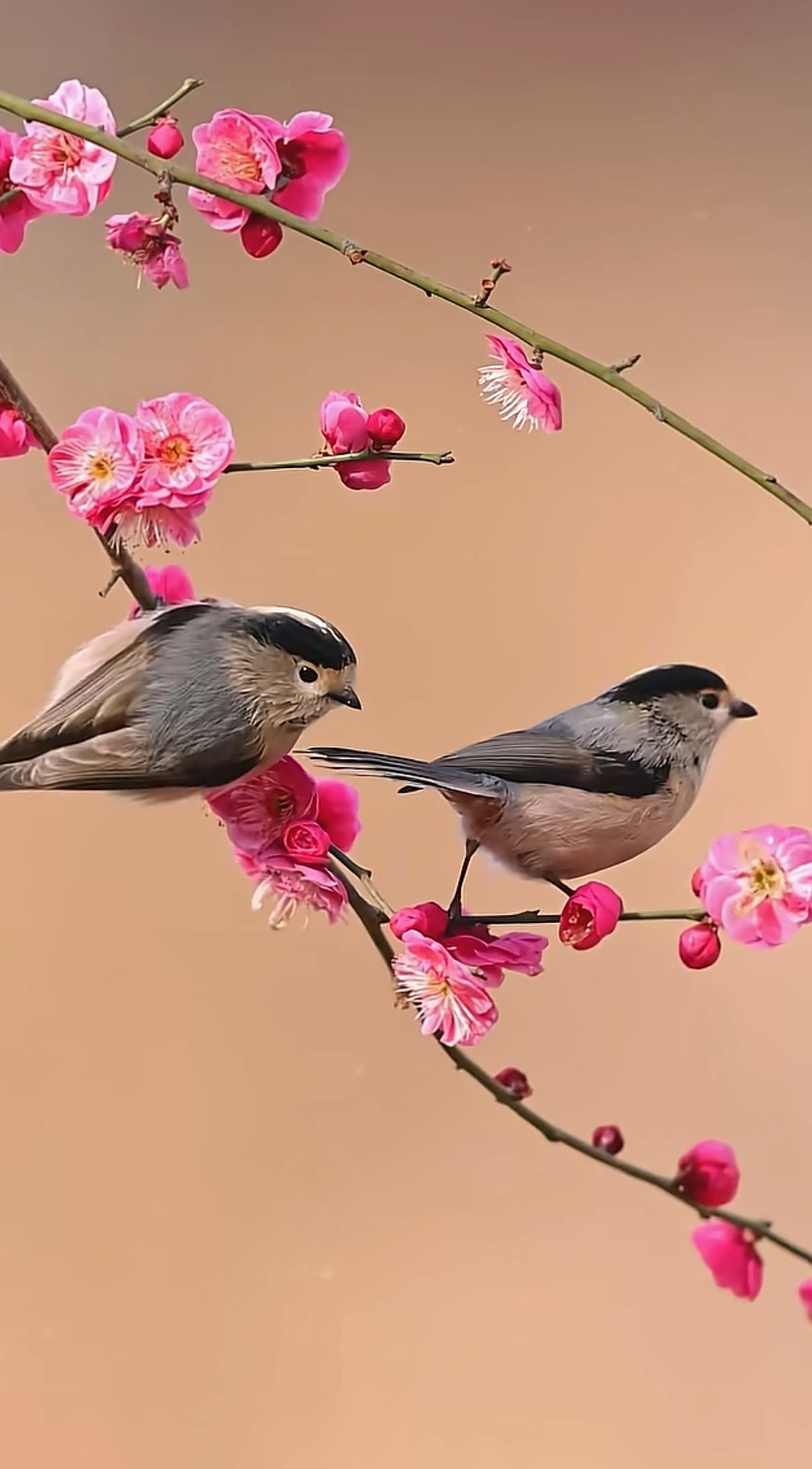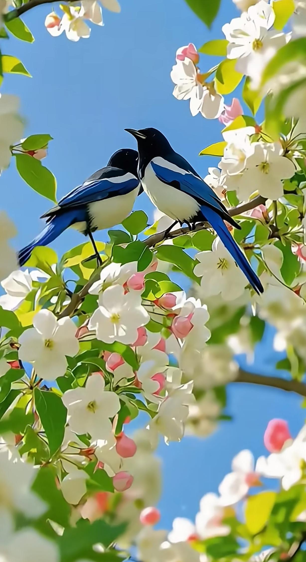 各色花儿开得正热闹,红的像火,白的似雪,粉的如霞,满世界都是姹紫嫣红。花枝上落满了小鸟,叽叽喳喳唱个不停,有的停在柳丝间,有的落在刚绽放的花朵上,活泼又可爱。蜜蜂在花丛中来回采蜜,嗡嗡作响,一派生机盎然。