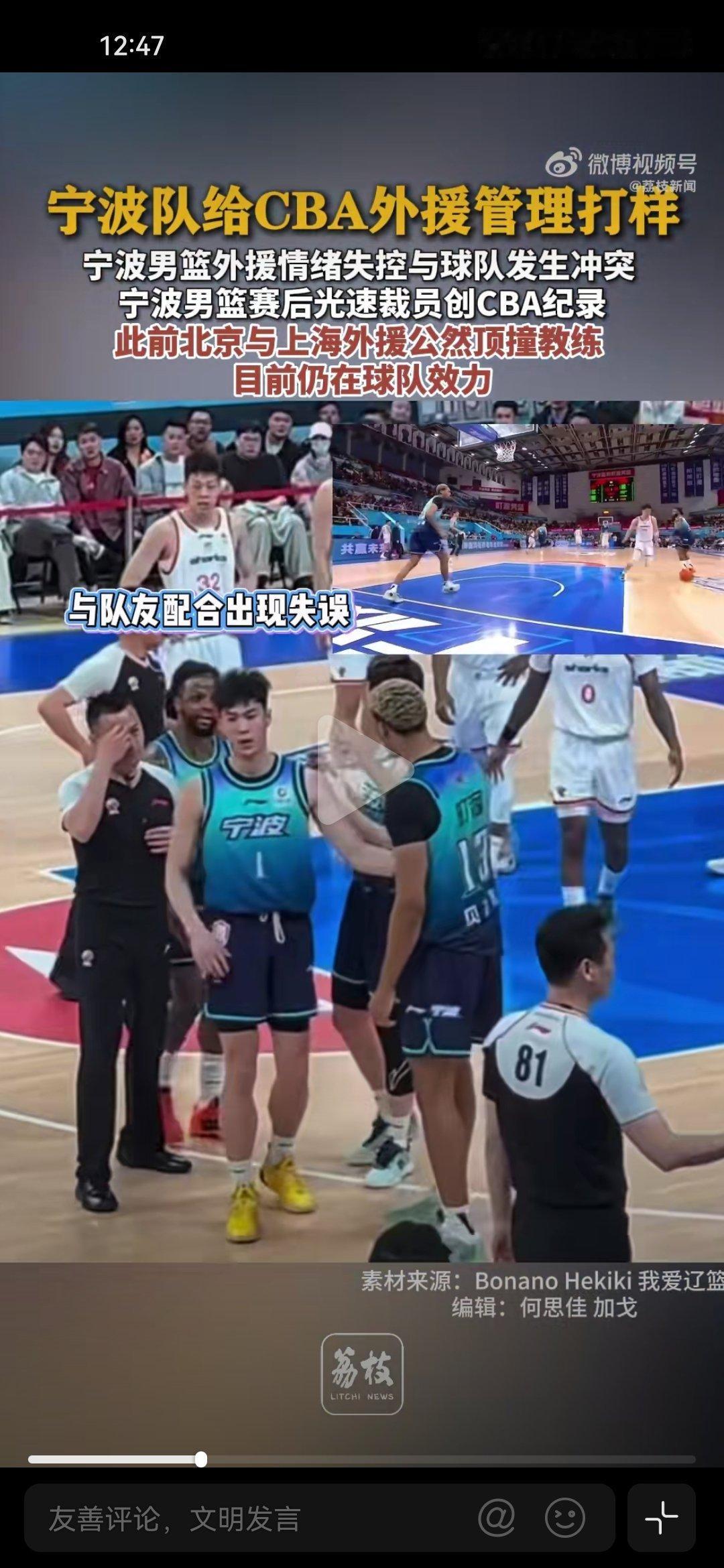 仅打55秒的外援贝兹利,场上情绪失控大闹内讧,宁波队赛后即刻解约,效率惊人。这就打破外援特权潜规则,彰显球队铁律。团队高于一切,职业素养比名气更重要。