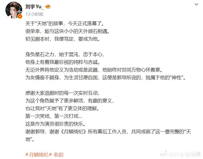 【刘宇发微博告别角色天地】刘宇发正式发文告别角色,字里行间满是对角色的珍视、对演绎的敬畏。能看得出来刘宇真的很爱这个角色发文告别也能看出满满的不舍!从入戏到落幕,他以细腻表演赋予角色灵魂,用真诚记录每一段角色旅程。角色虽告别,演员刘宇的故事仍在续写,期待他解锁更多精彩。刘宇