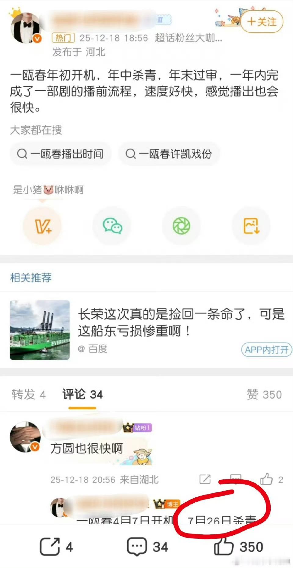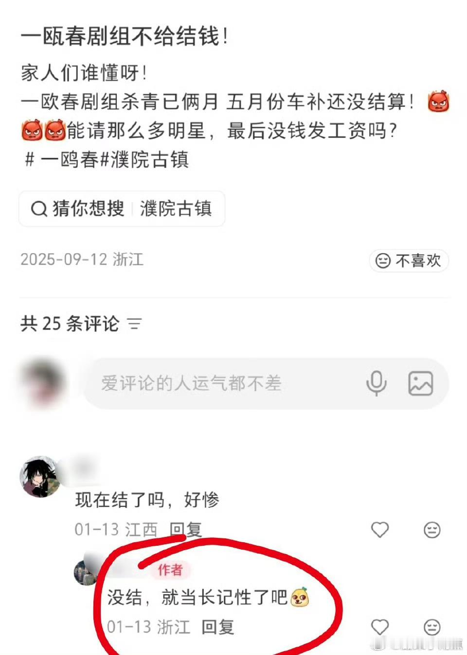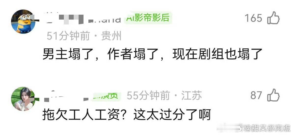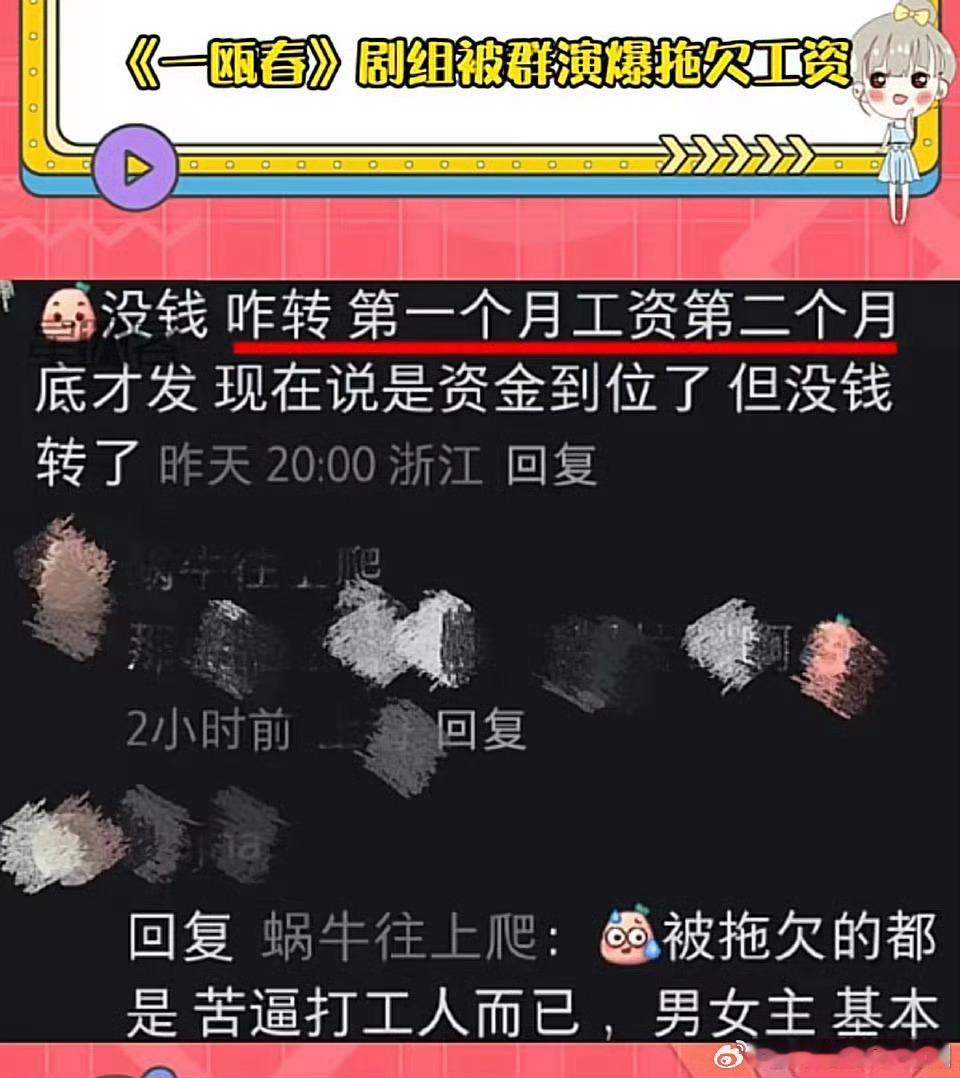 许凯 周也 徐振轩主演的《一瓯春》剧组曝出拖欠群演工资,到现在还没有删帖,许凯粉丝称 25年7月杀青,今年1月群演还回复网友称:没结。这两天又有网友出来锤剧组了…这么大的剧组拖欠工资这么久,反复有人出来讨薪,素人维/权不易,不知道剧组有没有给主演结工资呢?