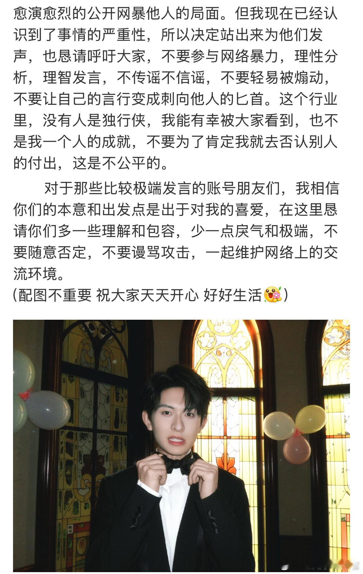 演员陈添祥于今日发布长文,就部分粉丝对合作团队的网络暴力行为公开致歉:1、编剧宇航:陈添祥提到2月直播中“剧本里有个问号”的言论被曲解为“编剧写空白剧本”,引发宇航遭遇大规模网暴(包括私信辱骂、谣言传播),澄清戏份减少是因自身进组时间冲突,与编剧无关。 2、造型师会会:合作多次的造型团队因近期作品遭粉丝攻击,陈添祥强调双方沟通顺畅,造型设计尊重角色设定且不断创新,对团队因此承受的负面情绪表达歉意。3、其他合作方:自2025年夏天起,导演、制片人、摄影师等合作者均因与其合作遭遇阶段性网暴,陈添祥呼吁尊重审美差异,停止攻击行为。并承认此前对极端言论的粉丝“表达不够坚定”,导致网暴合作方的情况恶化,现决定明确发声抵制网络暴力。