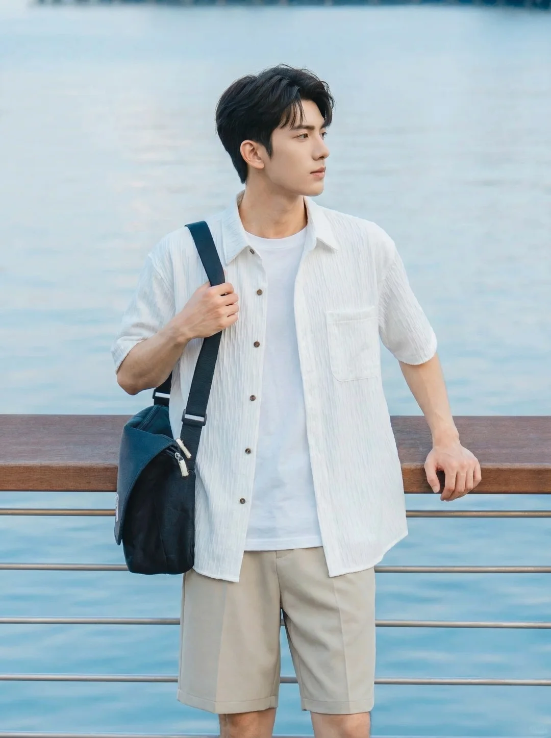 内搭一件重磅白T增加层次,领口一定要自然敞开,背一个黑色机能邮差包,少年气与都市感的平衡点抓得死死的,这种干净不费力的穿衣状态,才是夏日的正确打开方式