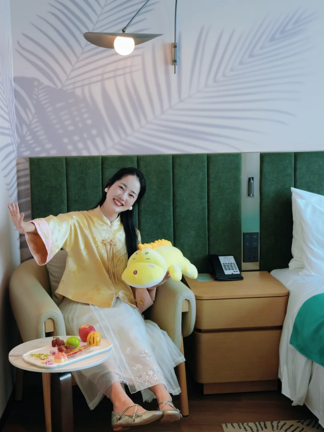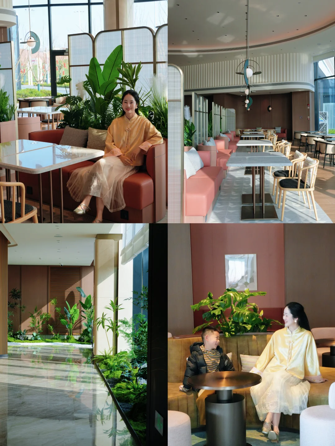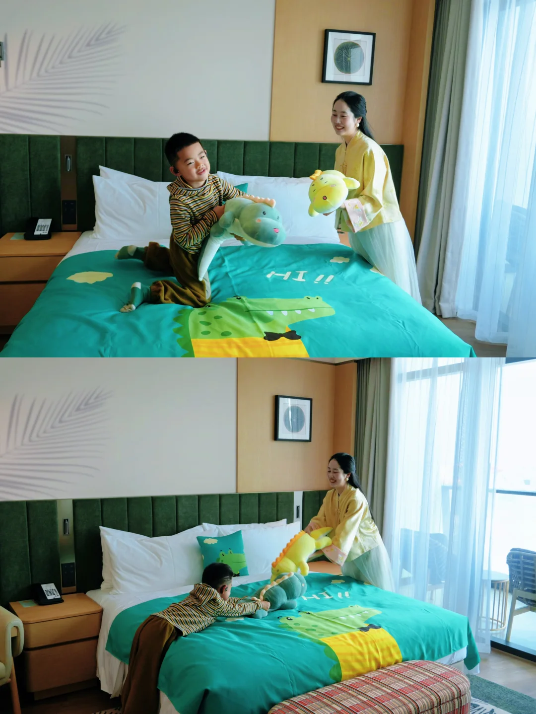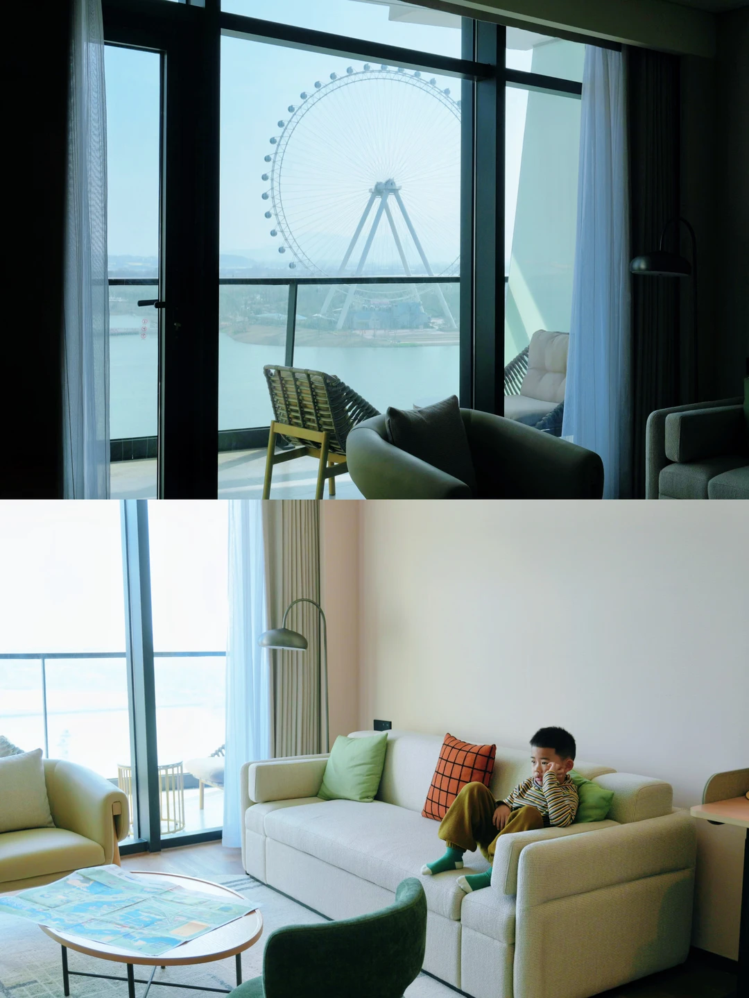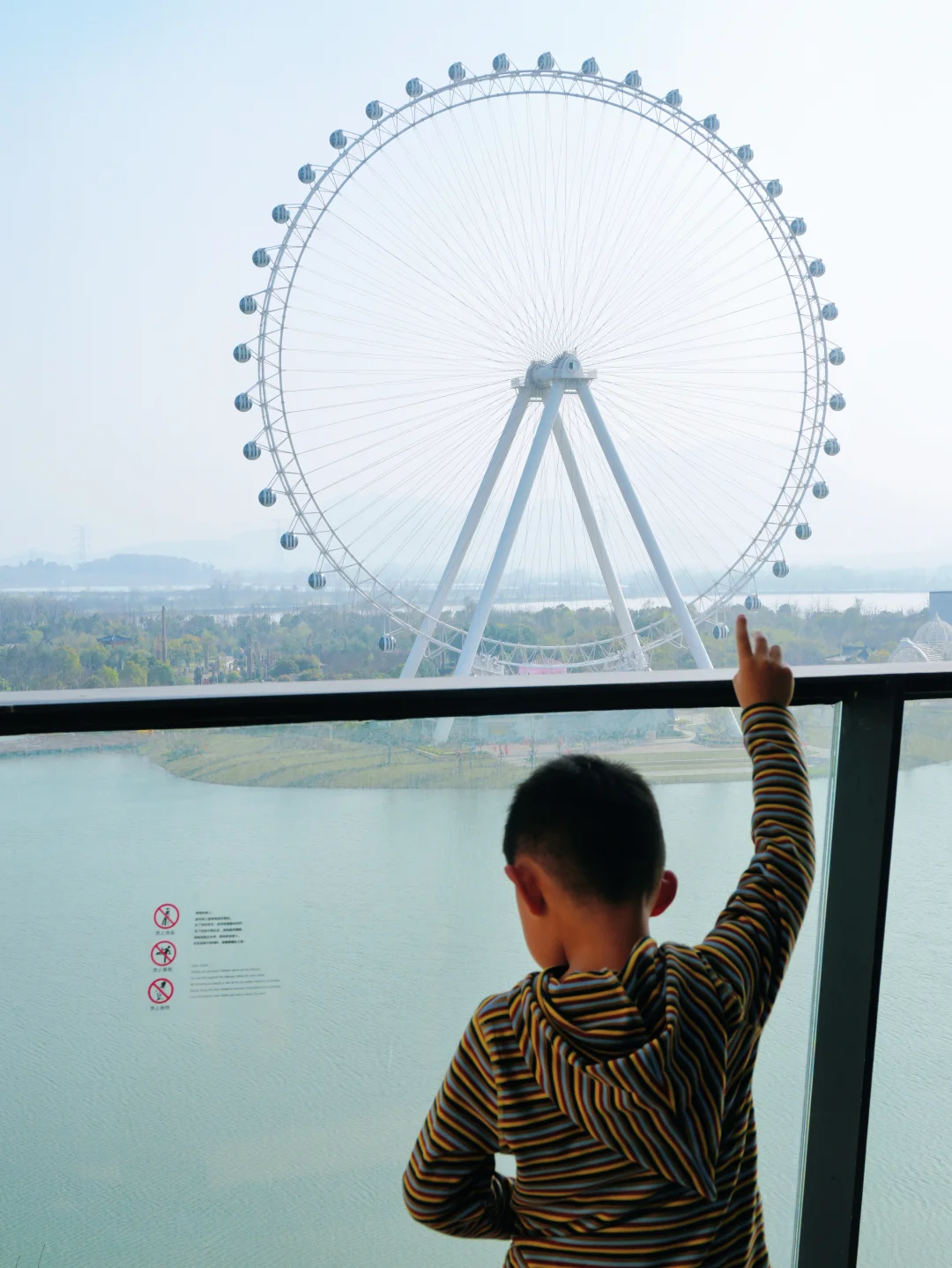 酒店紧邻恐龙奇域度假区,坐拥大冶湖碧波浩渺。躺在床上就能尽收湖光水色。傍晚时分,看落日余晖洒遍湖面,远处99米高的“黄石之眼”摩天轮静静矗立,氛围感直接拉满。