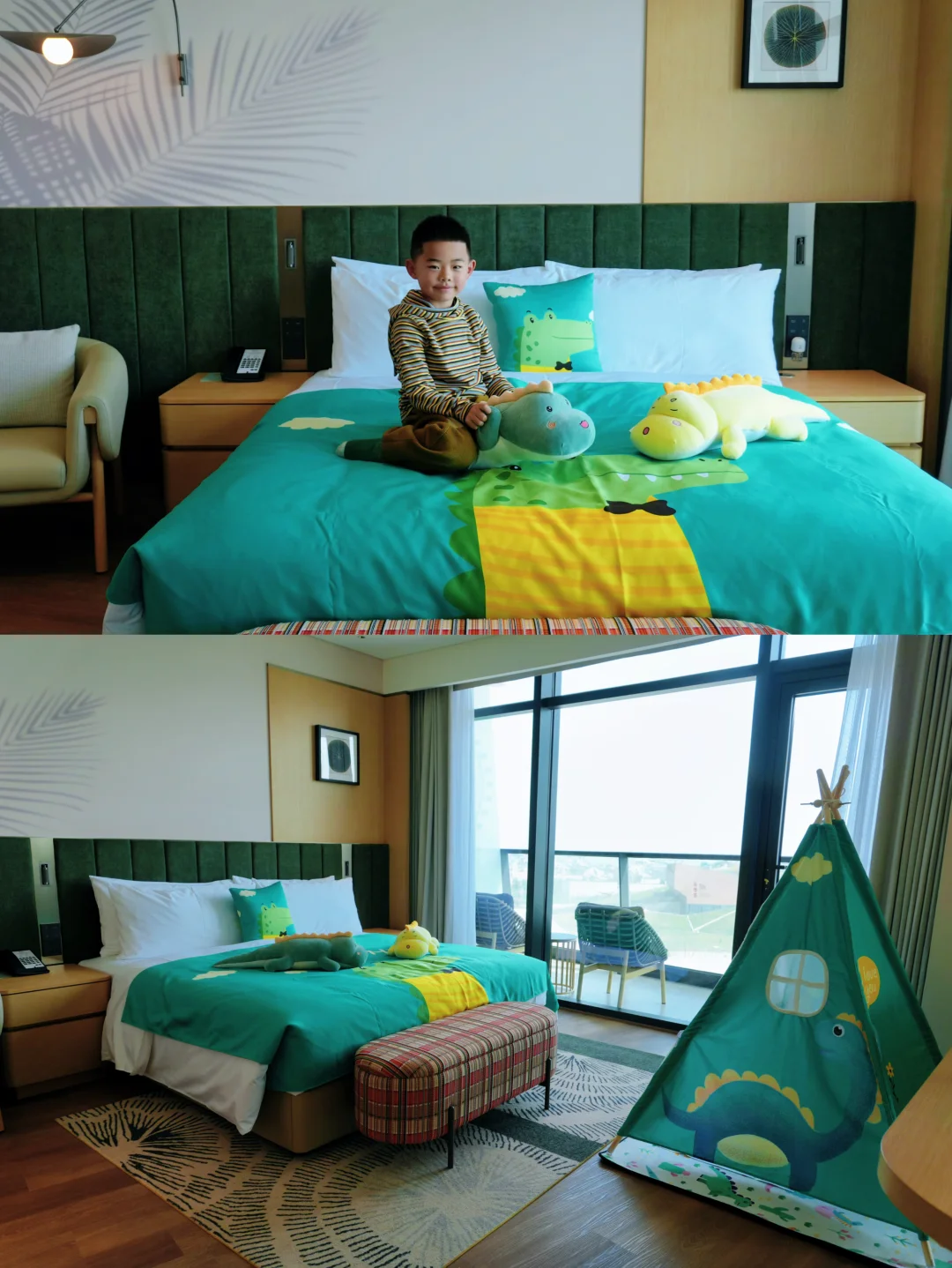 选了家庭套房,采光超好。床品是希尔顿一贯的舒适水准,枕头软硬可选,一夜好眠。卫生间干湿分离,洗浴用品味道很清新,细节到位。房间里有很多恐龙元素,娃瞬间爱上住酒店