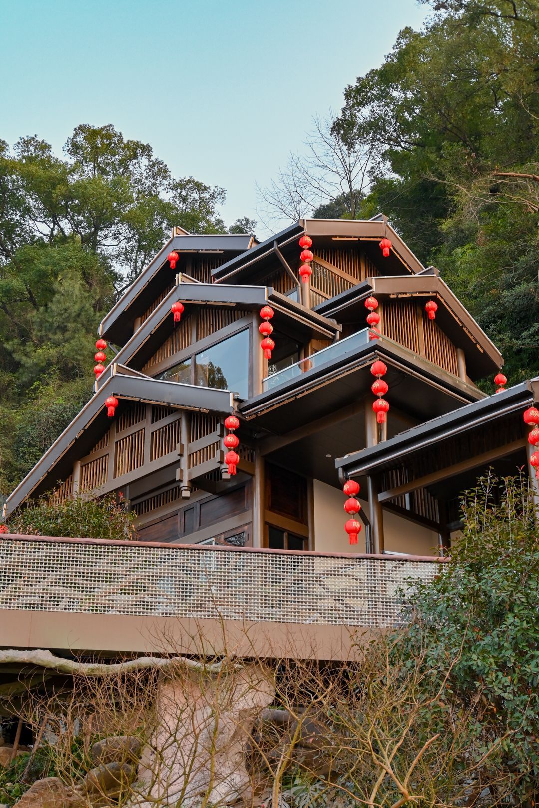 ✅ 温州园·山居叠瀑:层叠式木屋挂满红灯笼,依山就势藏于林间,尽显浙南民居“错落有致”的智慧~