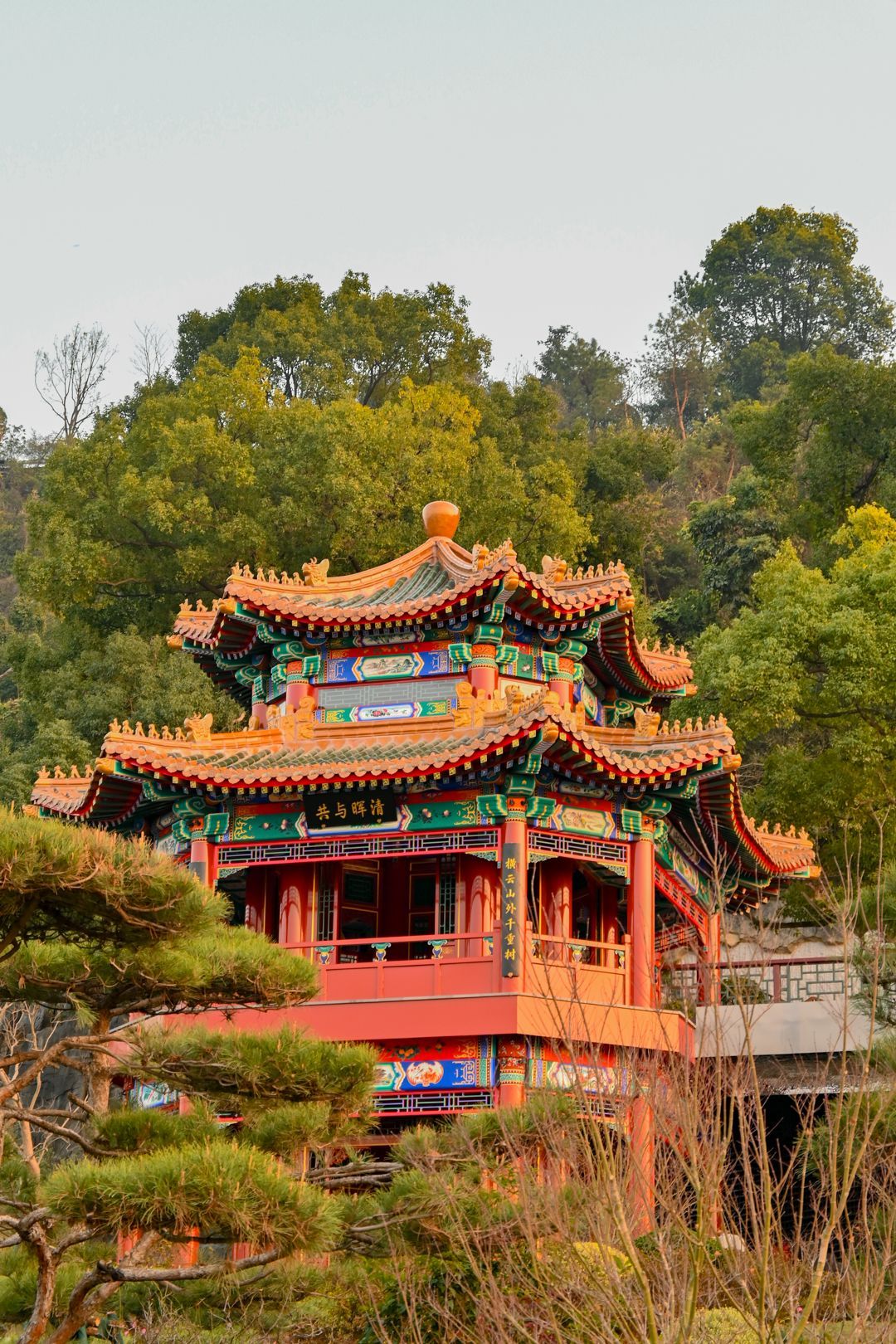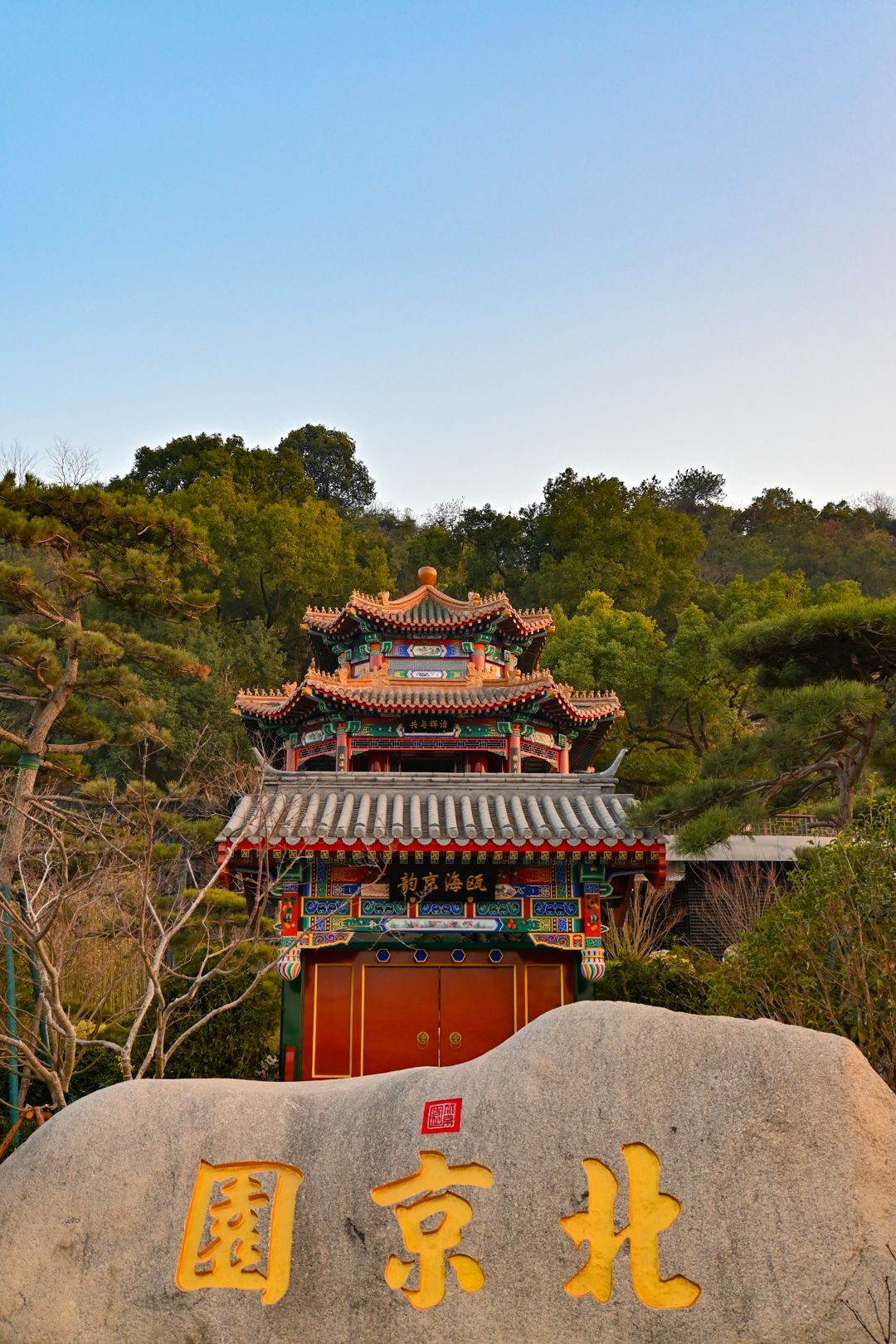 ✅ 北京园·皇家气派:重檐楼阁配红墙金瓦,匾额“北京园”石刻厚重庄严,一秒穿越紫禁城;