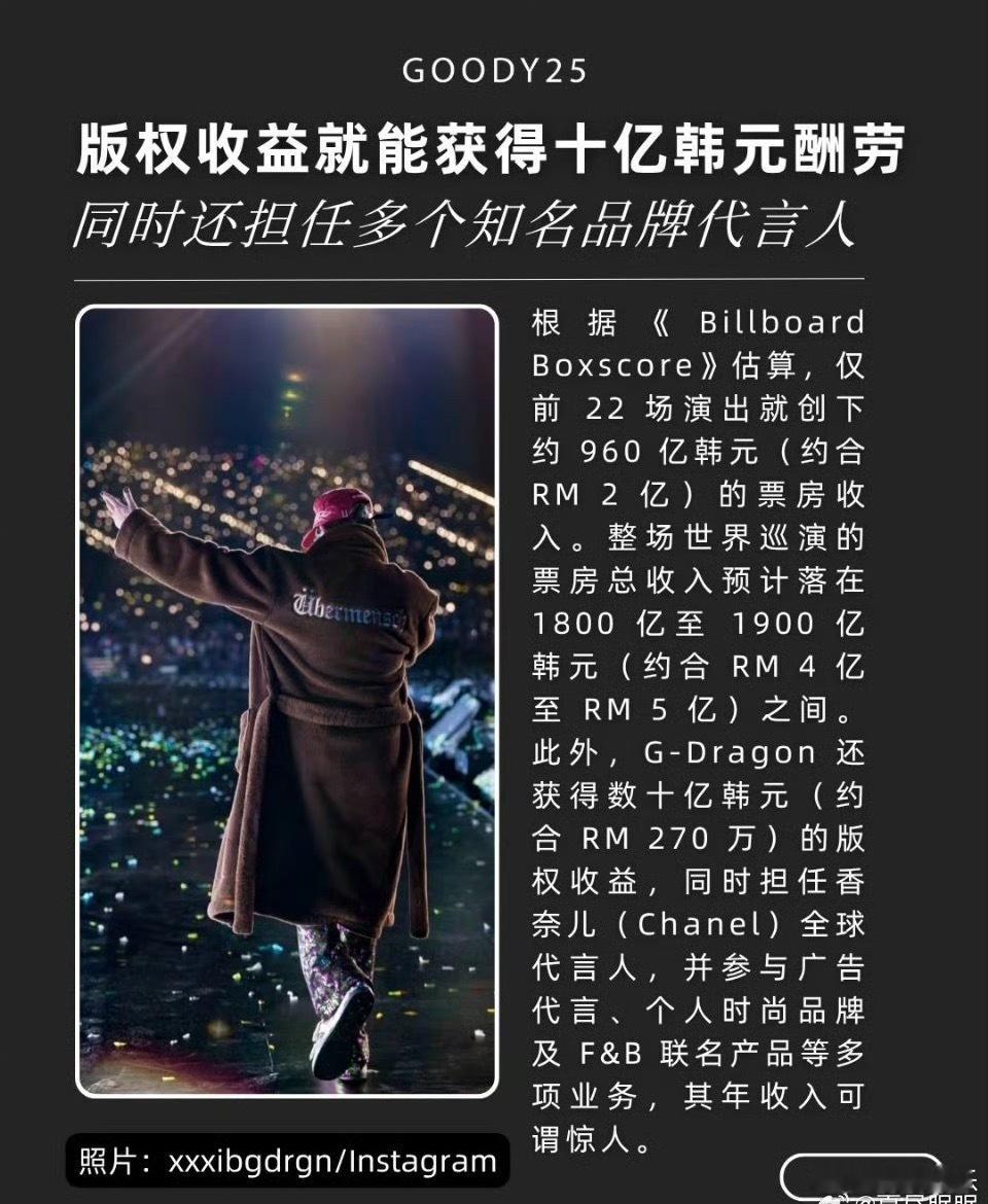 权志龙收入曝光人家开演唱会赚钱,他是直接把公司从亏损拉到盈利。巡演39场,82万