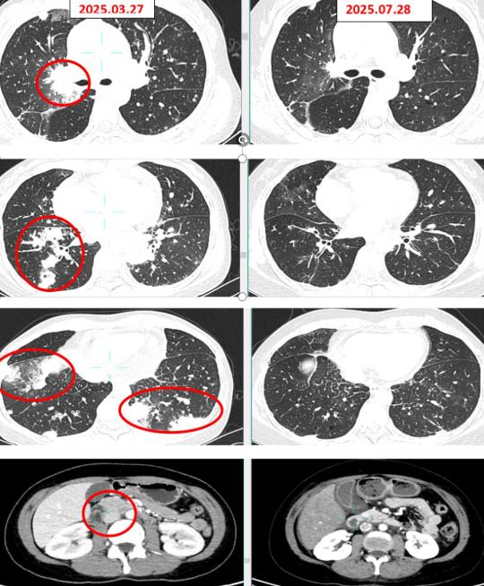 医生立刻针对性地使用NTRK抑制剂恩曲替尼,进行精准靶向治疗,没想到,奇迹真的发生了——用药仅仅3天,她身上的转移病灶就明显缩小,胸闷、乏力的症状也快速缓解,后续虽然因为药物副作用调整过方案,但在医生的细心照料下,肿瘤一直控制得很好。