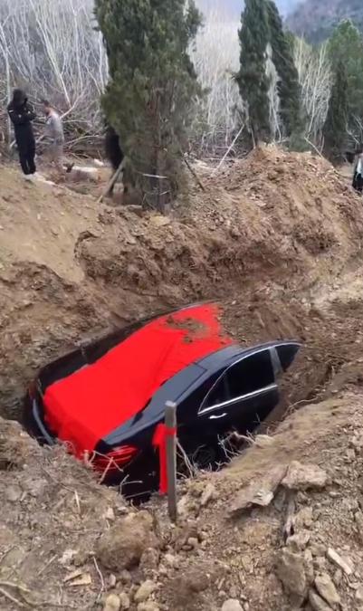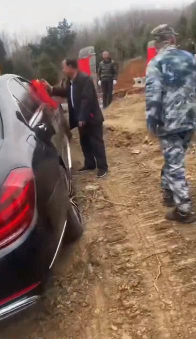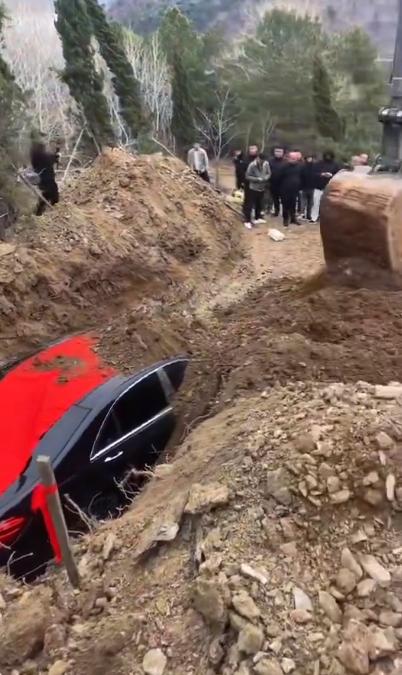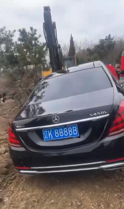 来自东北一场葬礼的视频,视频显示一辆黑色奔驰S450L(车牌号辽K·8888B)被挖掘机定位并埋入一个大型墓坑中,墓坑周围覆盖着红色丧布,还有围观者。