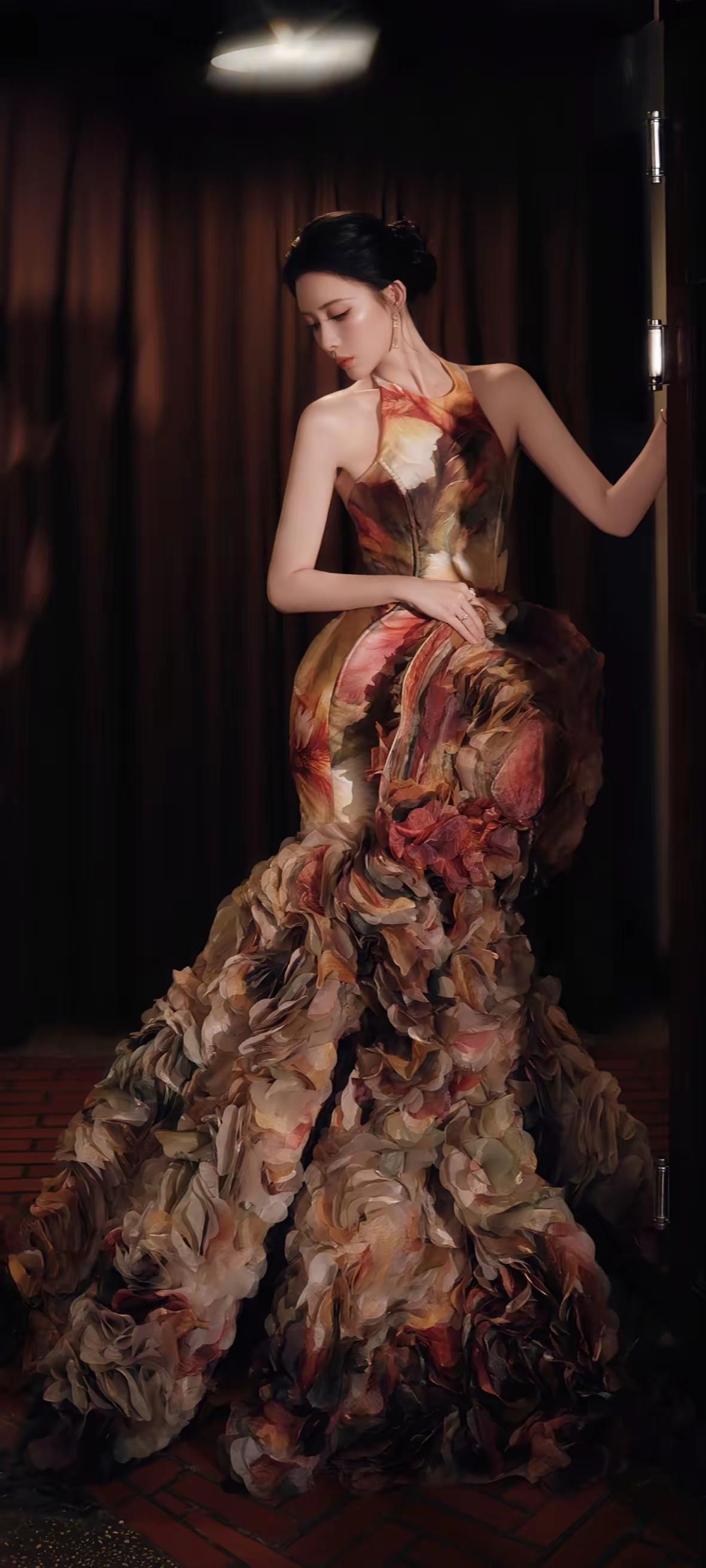 孟子义,暖光漫过复古廊间,油画感晕染的挂脖鱼尾裙勾勒出玲珑曲线,层叠花帽与立体裙摆织就法式浪漫
