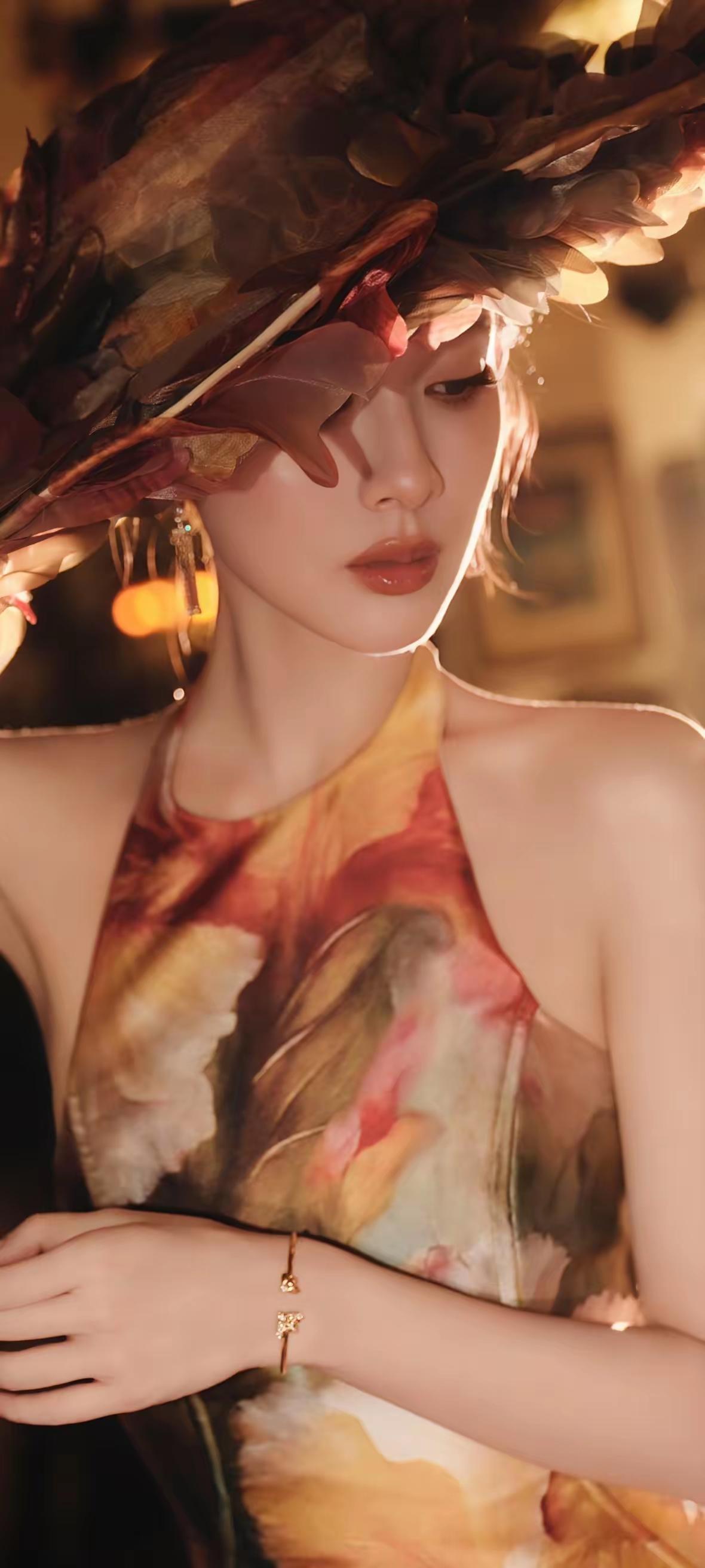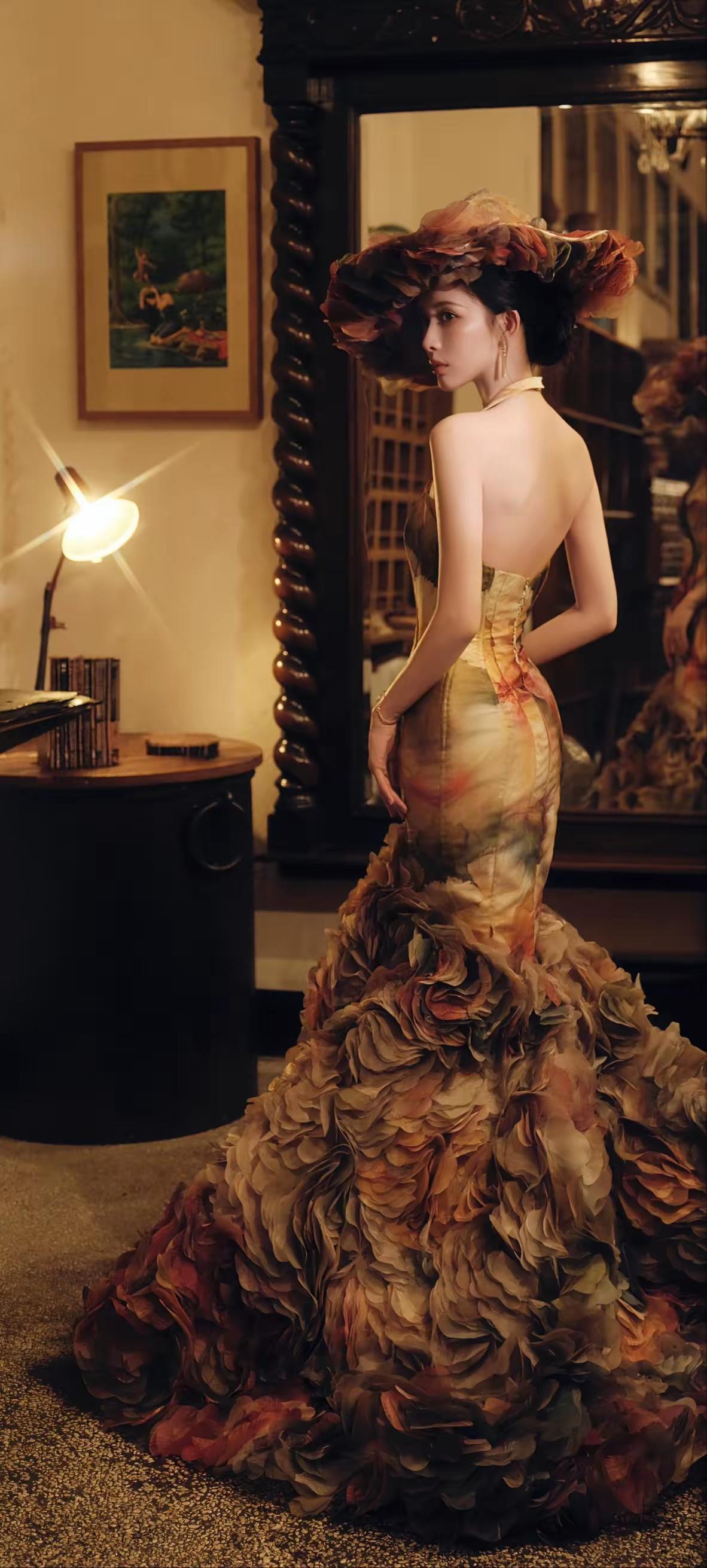 孟子义,暖光漫过复古廊间,油画感晕染的挂脖鱼尾裙勾勒出玲珑曲线,层叠花帽与立体裙