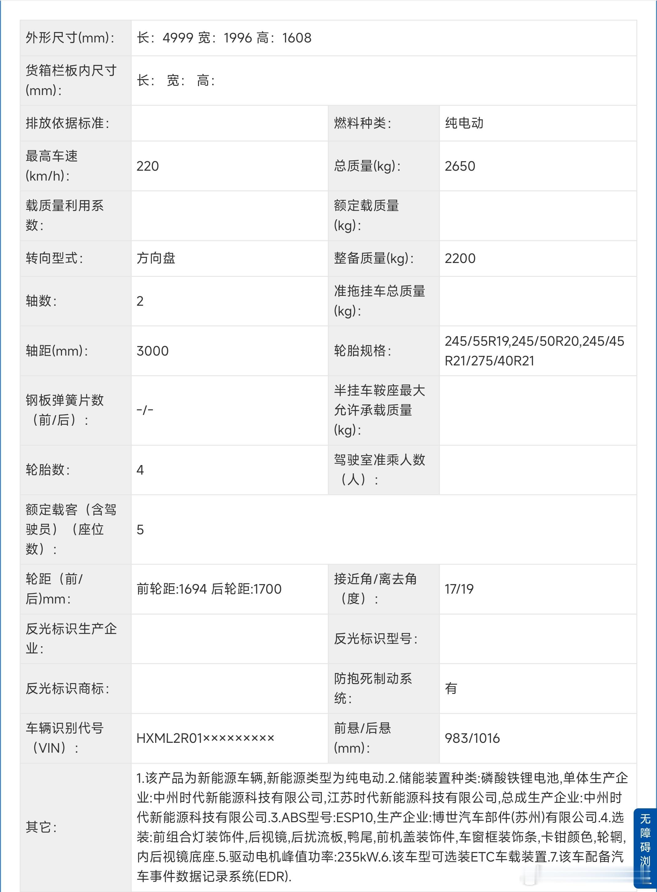 通过核心数据可以看出,新车整备质量2650kg,现款96.3度电版本是2765kg,整整轻了115kg,所以新版本基本就是电池少了20度左右,激光雷达还在,没减配置。价格上大概率降1万多,估计24万出头?