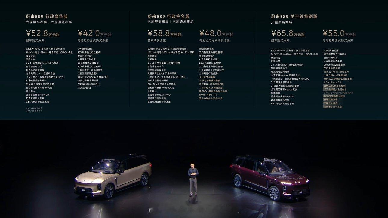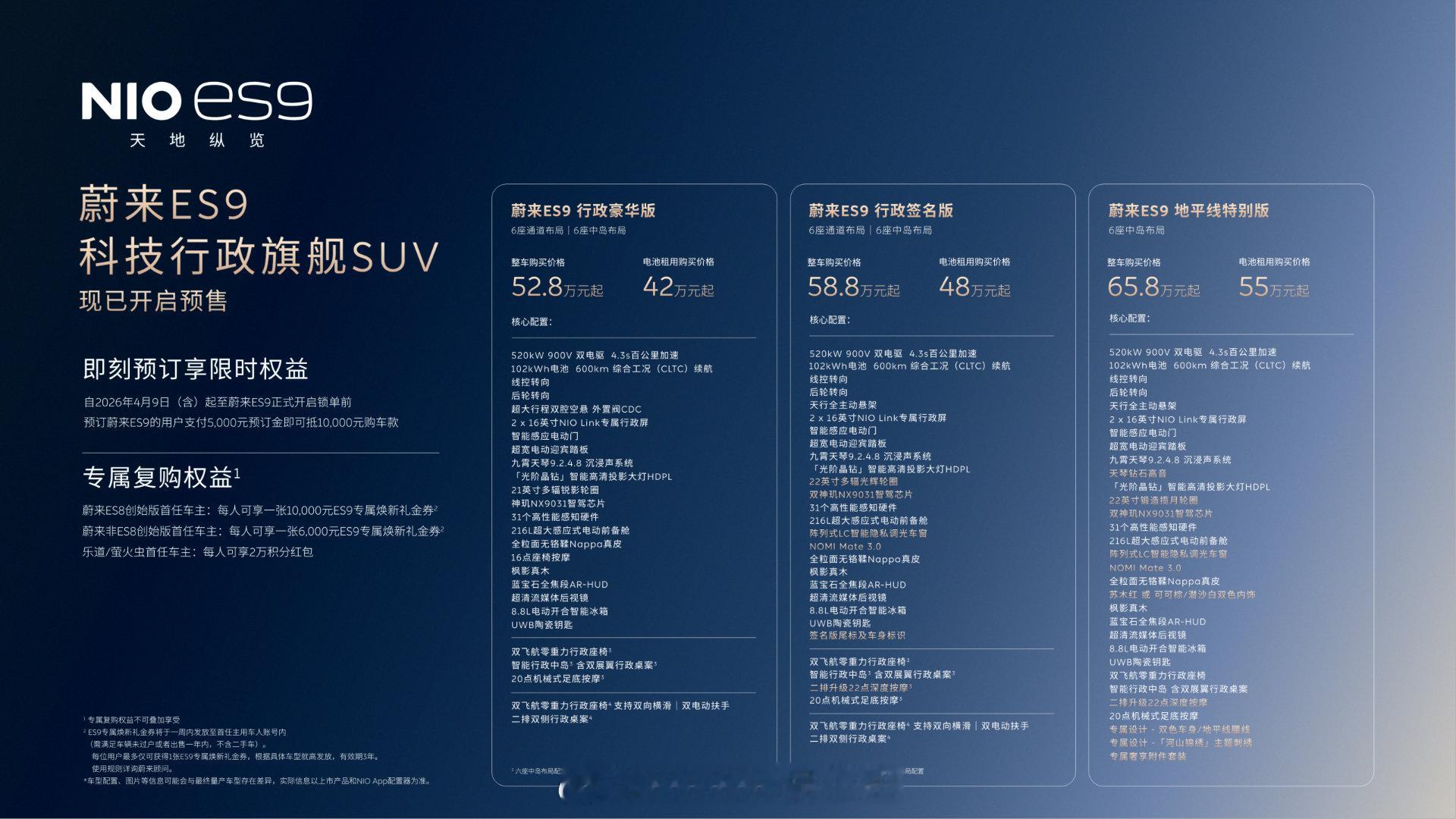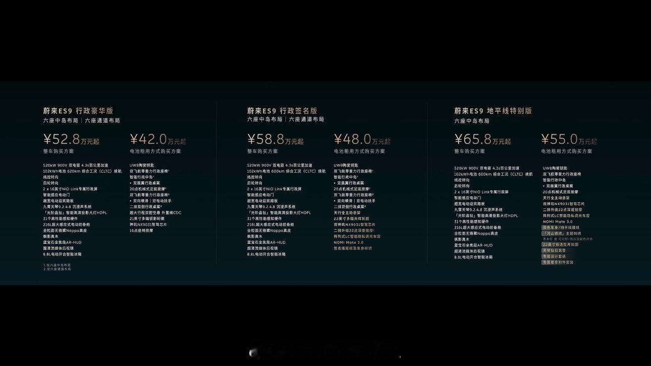 蔚来ES9中国元素三个版本:行政豪华版~行政签名版~地平线特别版预售价52.8,58.8,65.8~很多东西都是全系标配~baas的话最低42就能拿下了!不得不让我惊呼,您这?boom能hold住吗斌哥不管是TVC还是其他视觉,高级老钱豪华感扑面而来~(除了图一的海报排版)而且这个Horizon的高端命名,让我一下子就联想到了当年的A8 Horch~而那个卖多少钱这个才卖多少钱几年而已,中国汽车已经卷到让我们惊呼又惊呼的地步~哎,不得不感慨,有好审美的老板真好啊其实咱们不是没有好的设计师,而是拍板的人得会选才行北京车展我得去溜溜看~~怀疑这车的展台估计挤不进~~回头预判一下跟bba的展台热度比一比~我猜蔚来应该比bba热度高~~