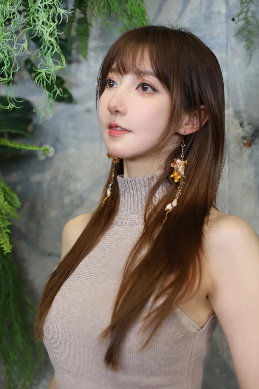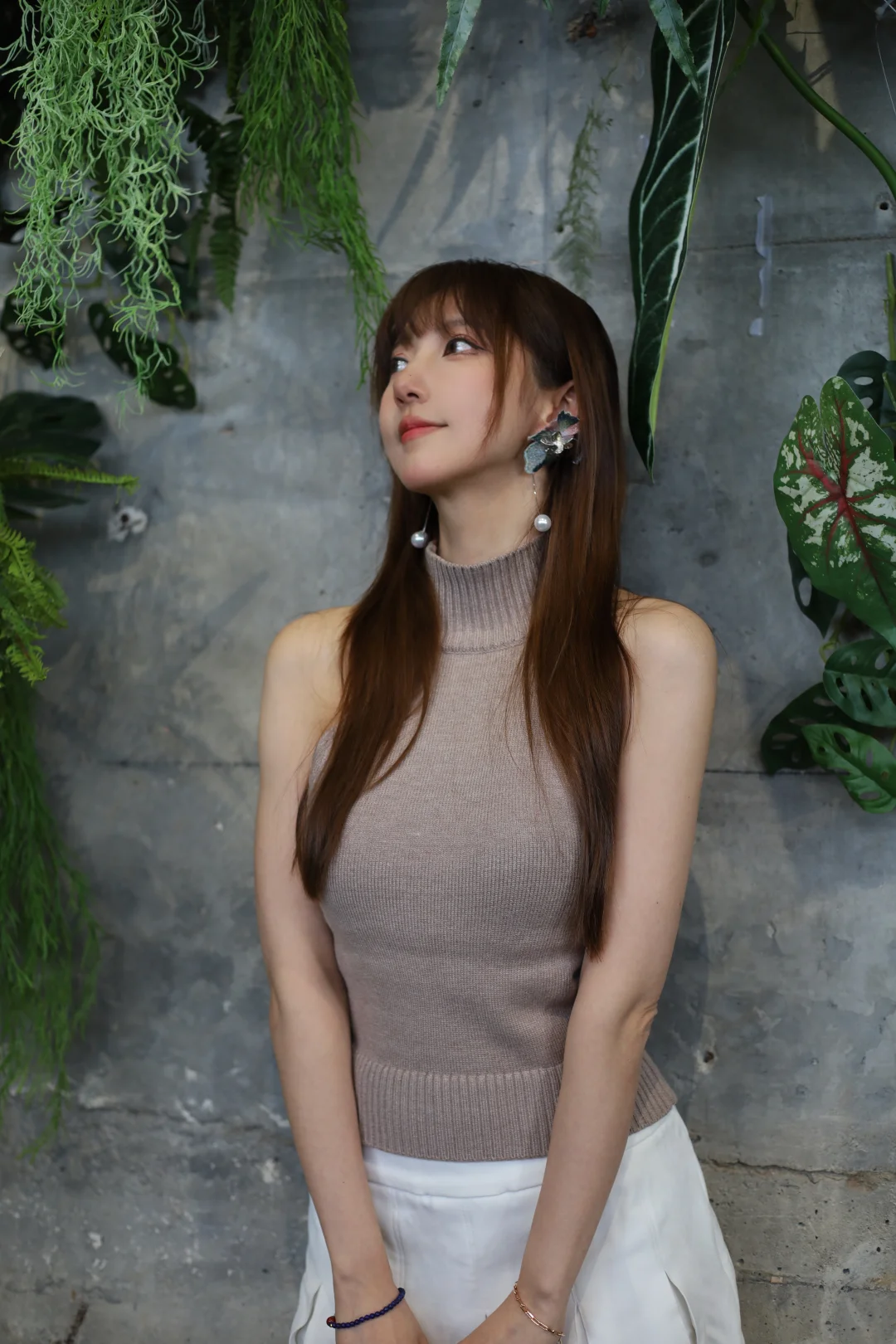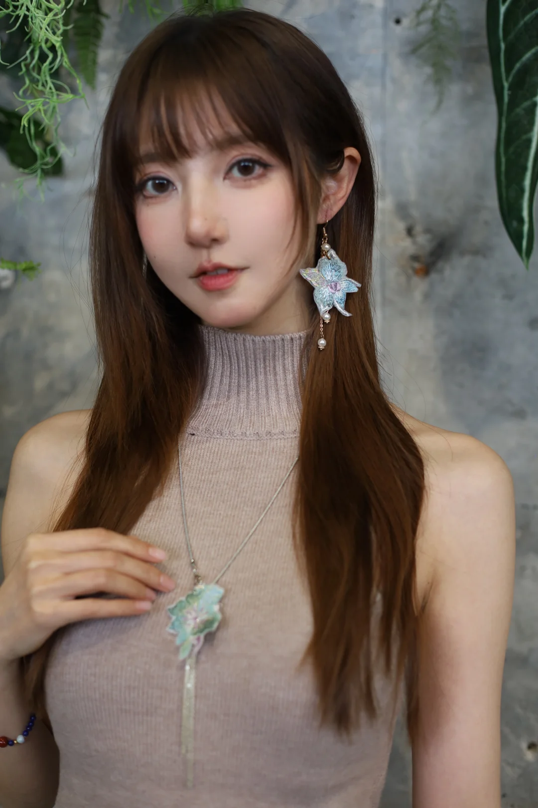 大美女棕发简约盘发,尖下巴比例匀称,冷白陶瓷嫩肌,精致淡妆,红吊带缀粉玫瑰刺绣,