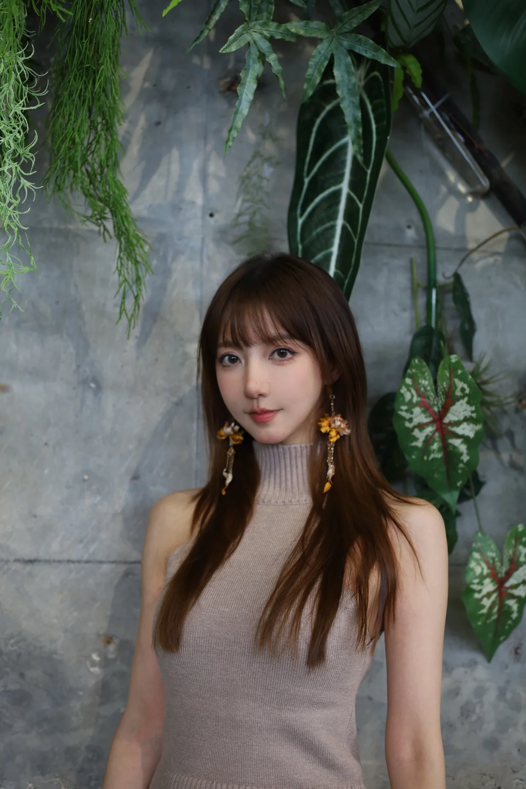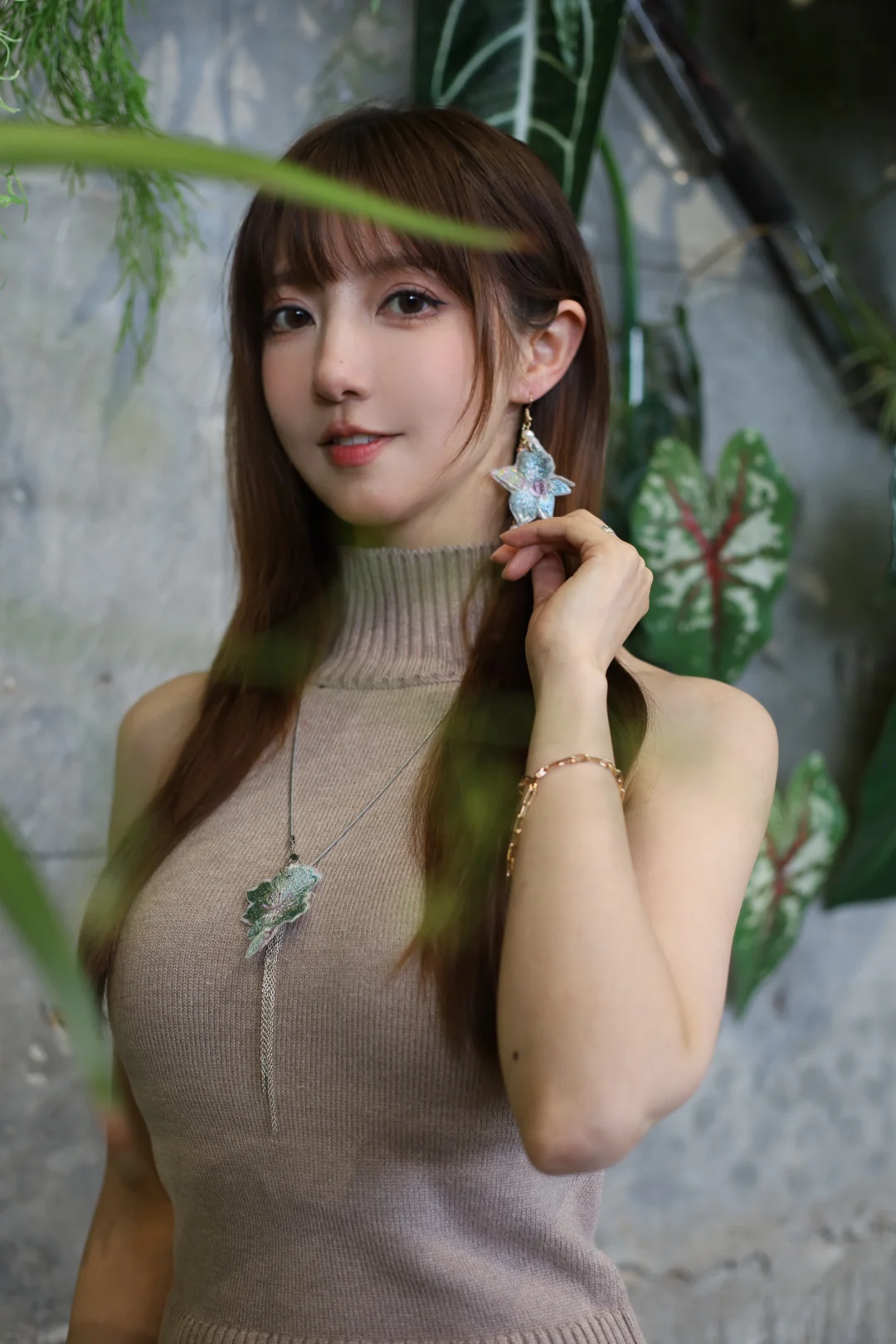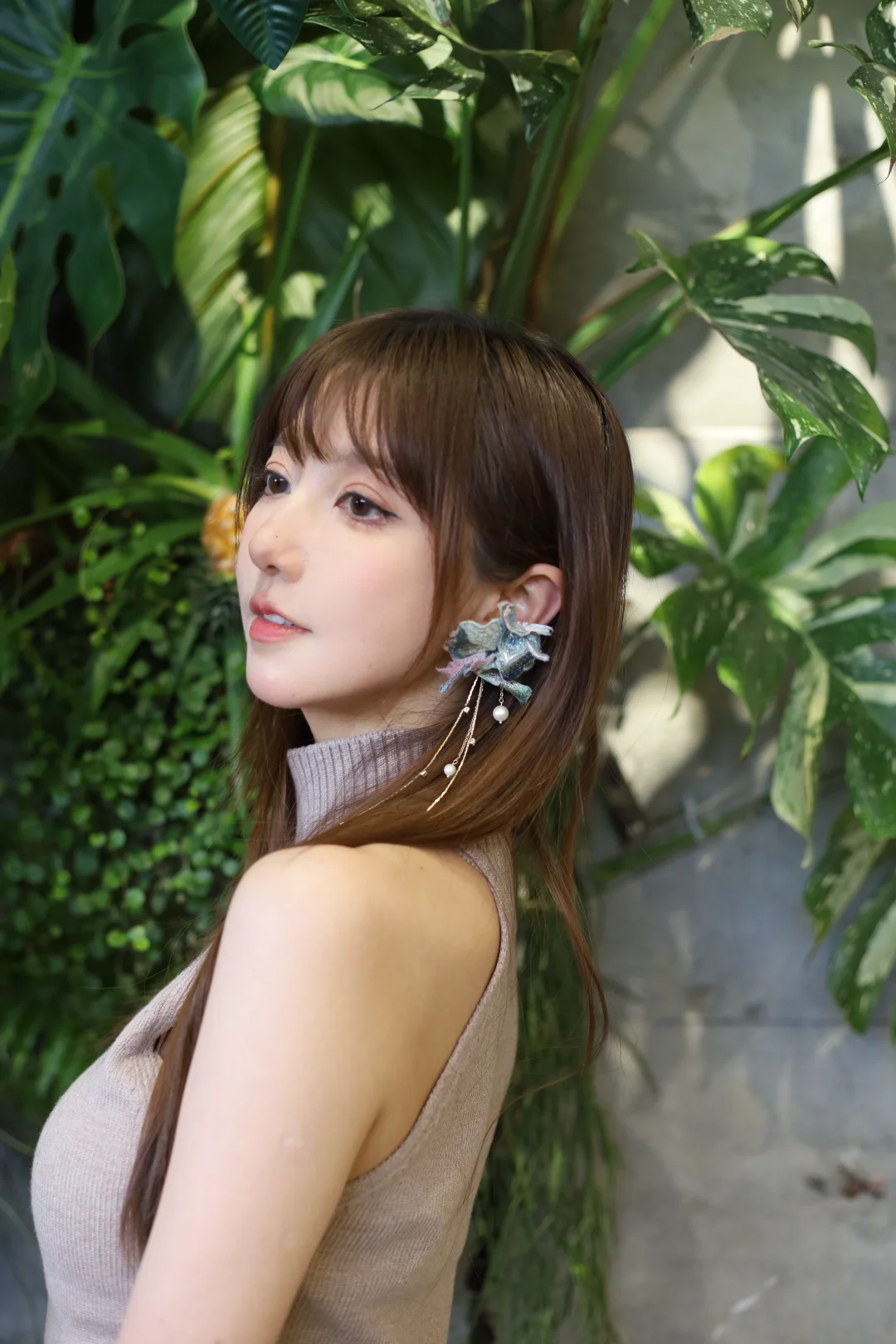 大美女棕发简约盘发,尖下巴比例匀称,冷白陶瓷嫩肌,精致淡妆,红吊带缀粉玫瑰刺绣,