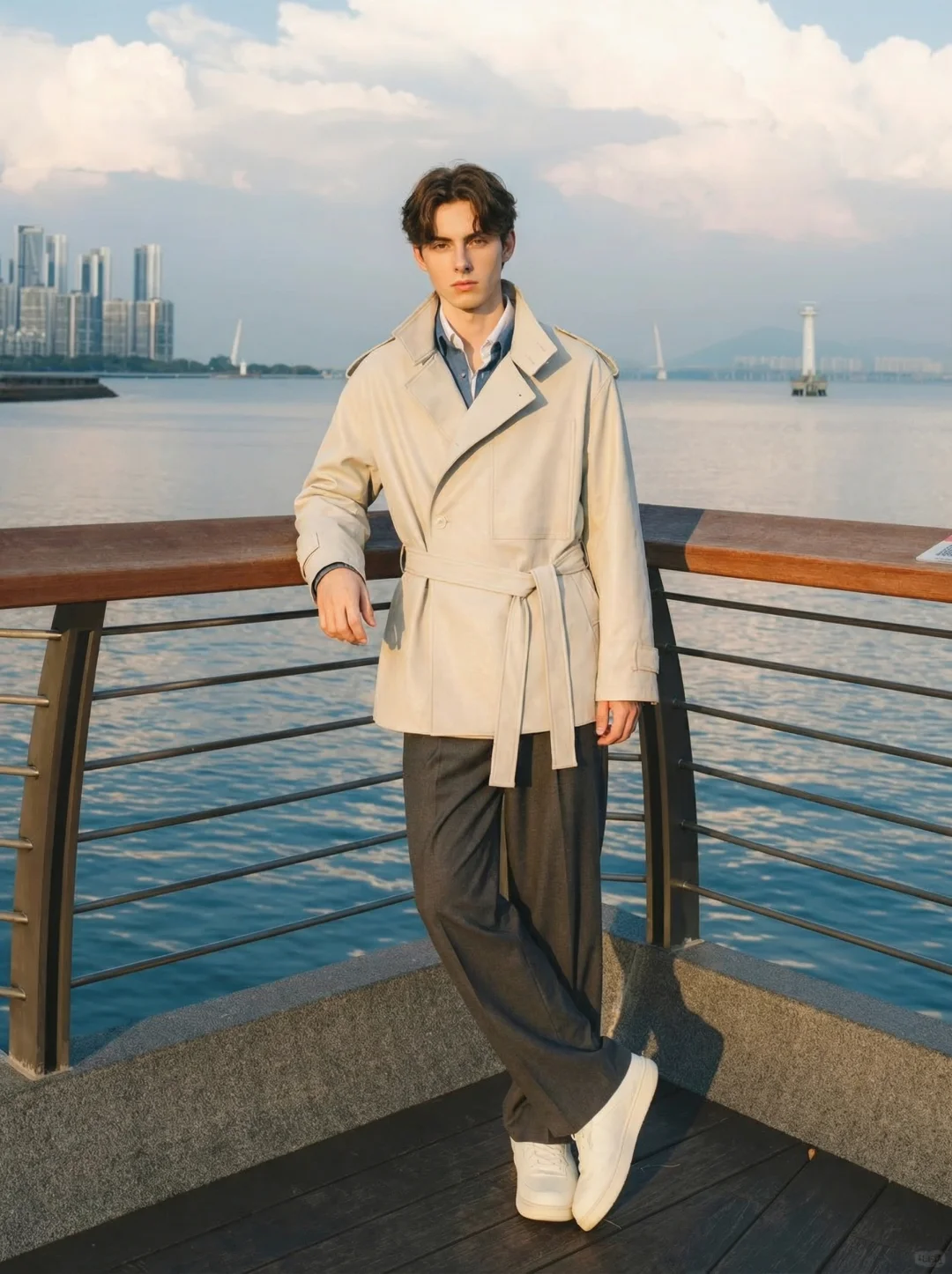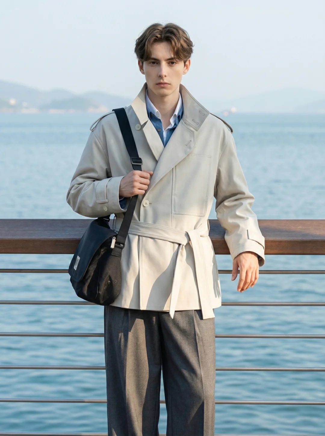 像我们这种身高,最怕的就是被长款压垮。这件短款立领设计,刚好卡在腰线以上,配合腰带随性一扎,身材比例瞬间被重新定义。没有冗余的装饰,只有剪裁带来的力量感。