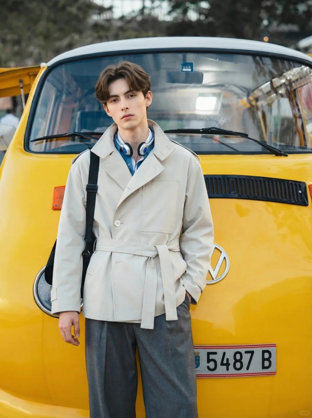 内搭选了这件飘带衬衫,克莱因蓝的静谧和米色风衣撞在一起,是那种低调的老钱审美。领口的飘带不需要系得死板,解开两颗扣子随风飘动,就是那种松弛的“雅痞”氛围。