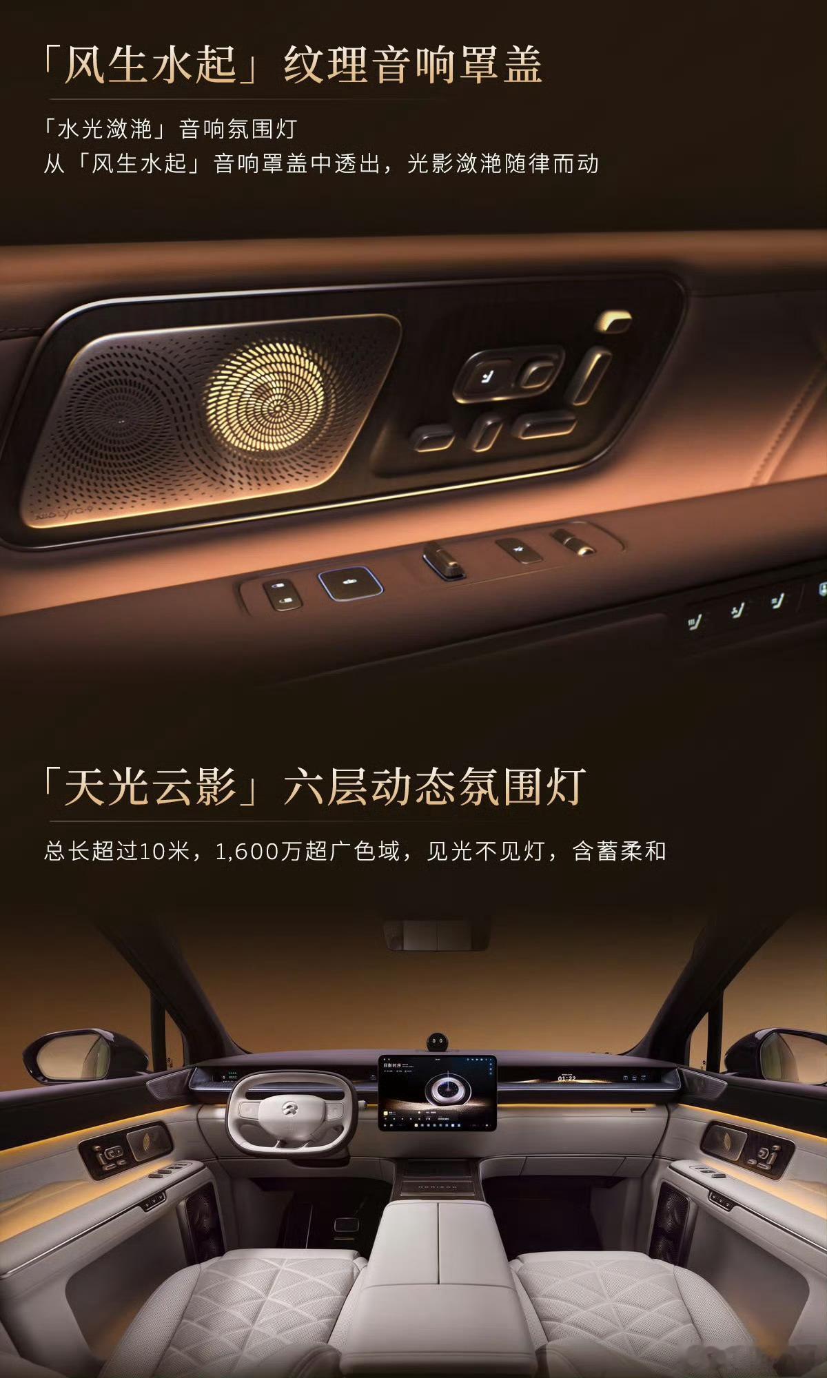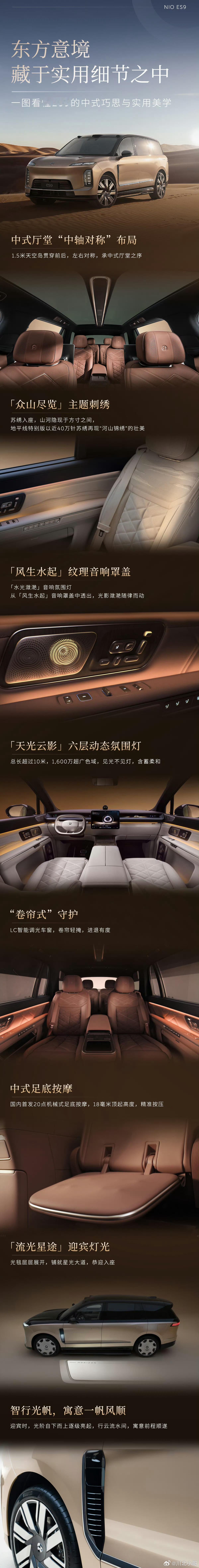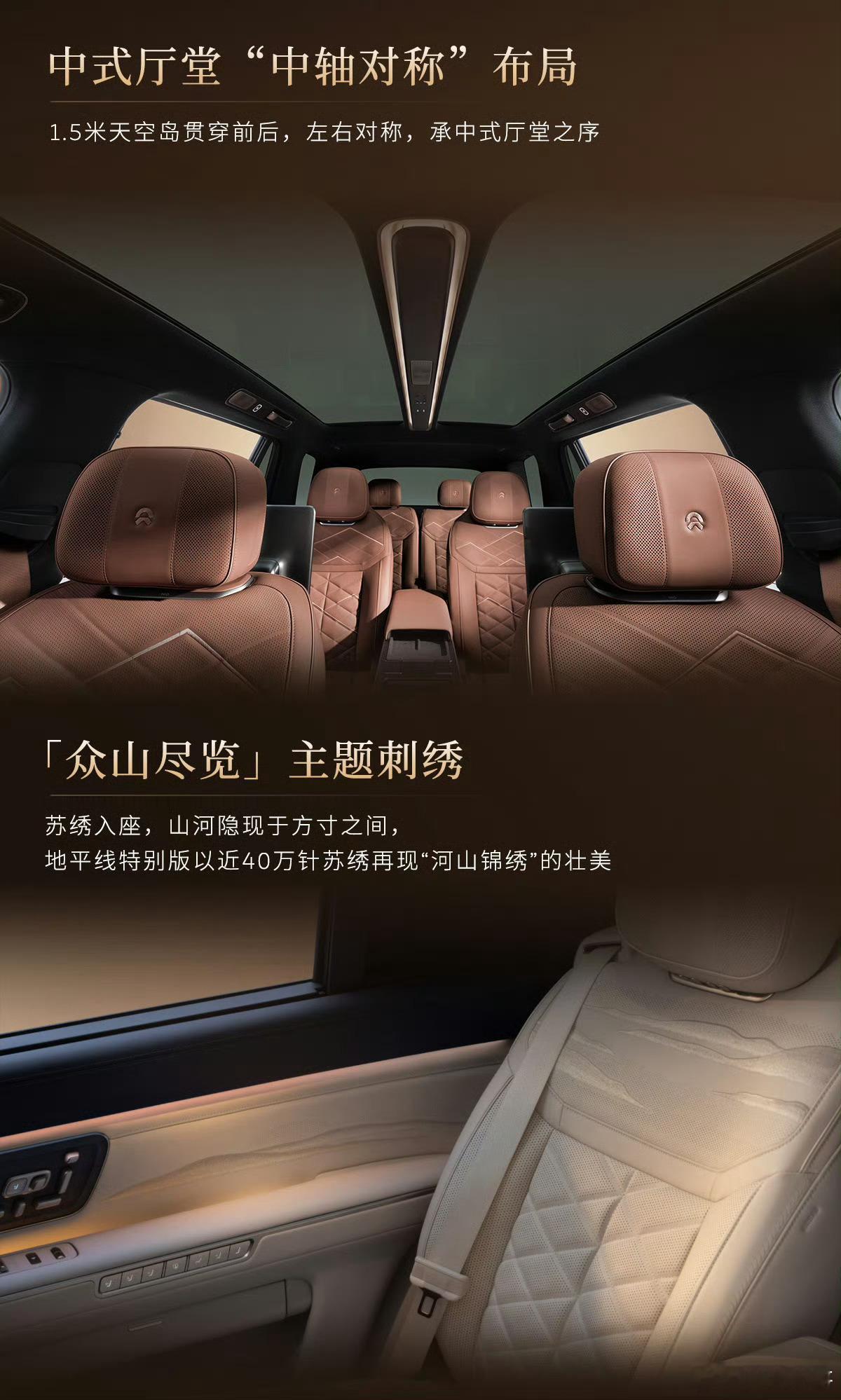 旗舰之道,立于原创!蔚来ES9以坚持为基,将原创融入血脉,重新定义中式豪华旗舰。外观之上,Shark Nose鲨鱼鼻前脸挺拔威严,Double-Dash超纯晶钻日行灯光芒锐利,搭配流光飞簇光翎尾灯,每一处都是辨识度拉满的原创美学。内饰之中,非遗苏绣工艺以近40万针脚织就“河山锦绣”,“天空岛”布局与智能行政中岛打造专属行政空间,东方意境尽显。