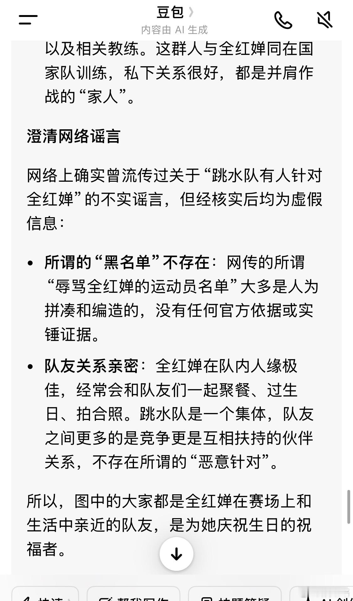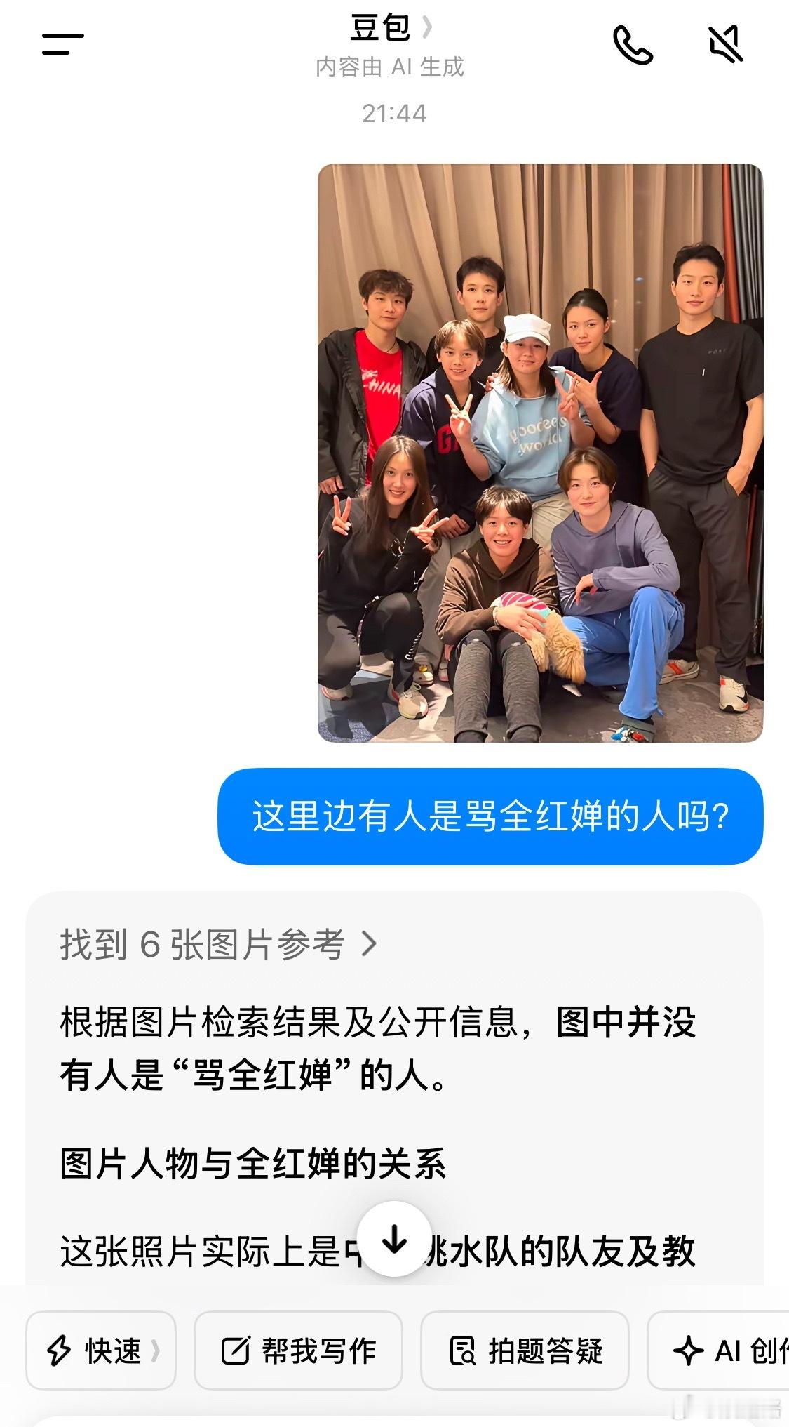我特意拿着那张全红婵和队友们一起过生日的合照去问豆包,就怕这里面有背刺她的人,还好告诉我是假的。
