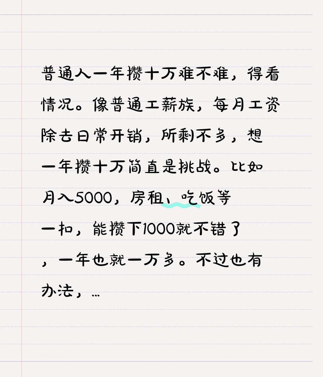 普通人一年攒十万难不难,得看情况。像普通工薪族,每月工资除去日常开销,所剩不多,想一年攒十万简直是挑战。比如月入5000,房租、吃饭等一扣,能攒下1000就不错了,一年也就一万多。