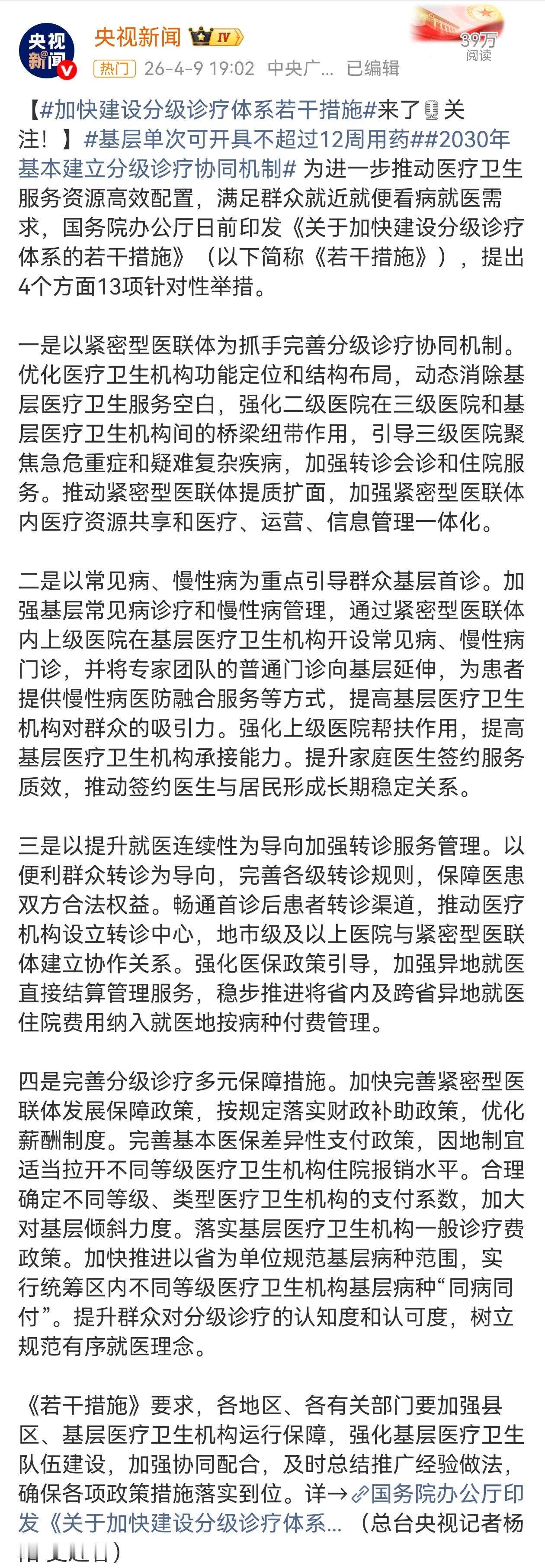 13条举措加快建设分级诊疗体系,是推动医改走向深水区的重要举措,希望能重塑整个医疗服务格局,对医患双方和社会都是好事。13条举措加快建设分级诊疗体系