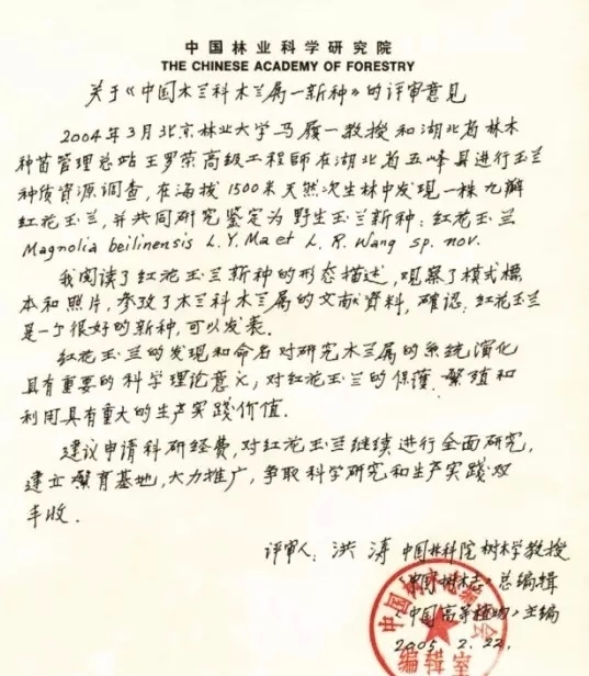 ² 非常有意思的是,世界上还存在全红的木兰!就是红花木兰。也叫五峰玉兰。因为它是2004年北京林大马履一教授带人在野外发现的。当时很惊奇,问了林科院分类专家,建议他们申请经费研究。图2。