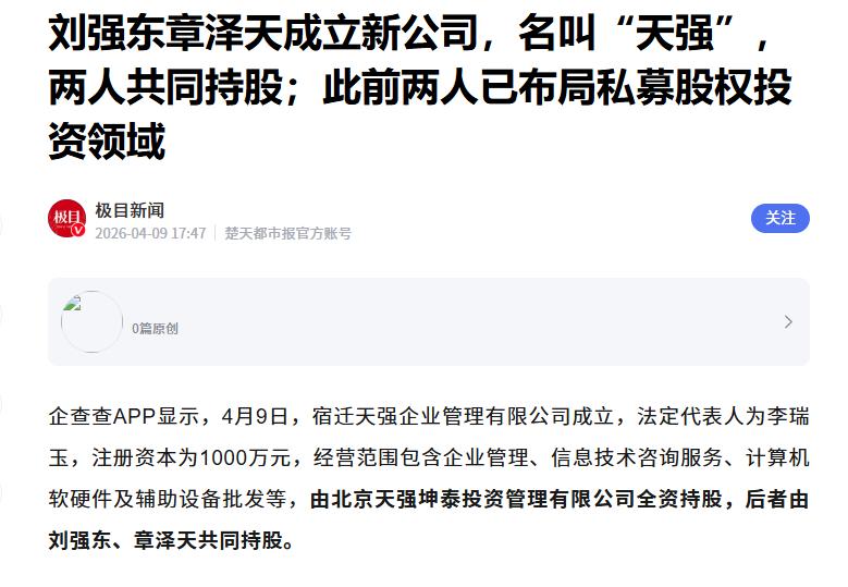 据媒体报道,4月9日,宿迁天强企业管理有限公司正式成立,经营范围含企业管理、信息技术咨询服务等。 值得一提的是,该公司由北京天强坤泰投资管理有限公司全资持股,而“北京天强坤泰投资管理有限公司”则由刘强东、章泽天共同持股。