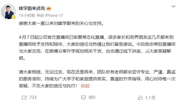 针对直播间已恢复常态化直播这件事,张雪峰的接棒人“峰学蔚来武亮”也发文表示:“请大家相信,无论过去、现在还是将来,团队所有老师都会坚守专业、严谨、真诚的服务准则,持续为广大学子和家庭提供务实、靠谱的升学指导,用心对待每一次答疑、不负大家的信任与托付!”