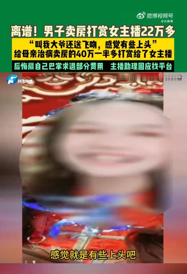 河北保定43岁马先生卖房给母亲治病,这份孝心本来没什么可指责的,可治疗后剩下的钱,他说自己在直播间被人几句 “大爷” 喊得迷失自我,一口气打赏出去22.5万。