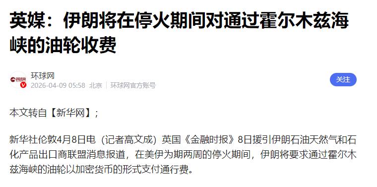 伊朗放大招了,趁着美伊停战的这两周,直接对霍尔木兹海峡的过往油轮,开始收取通行费了,最狠的是,只收比特币,美元、欧元啥的,一概不接!