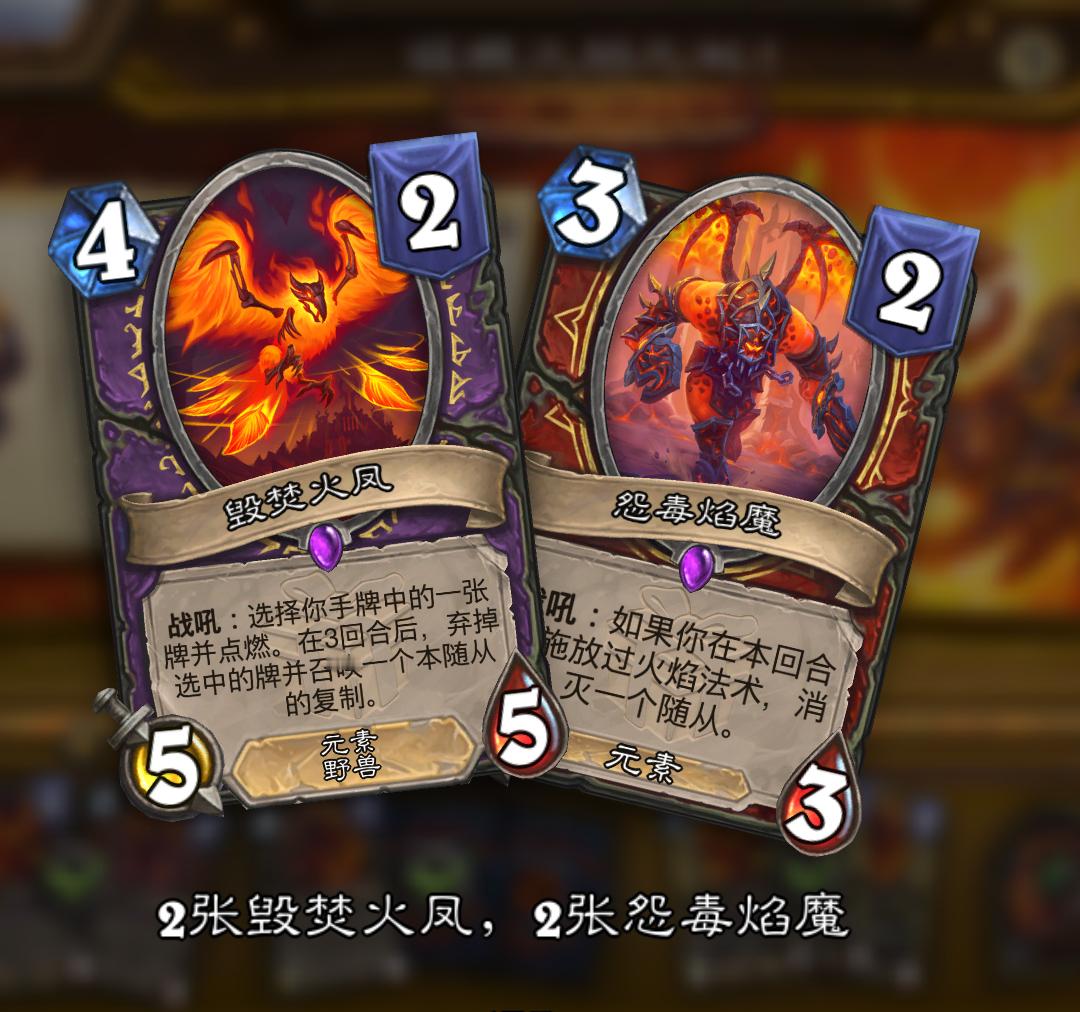 术士史诗随从,4费5/5,元素+野兽战吼:选择你手牌中的一张牌并点燃。在3回合后,弃掉选中的牌并召唤一个本随从的复制。