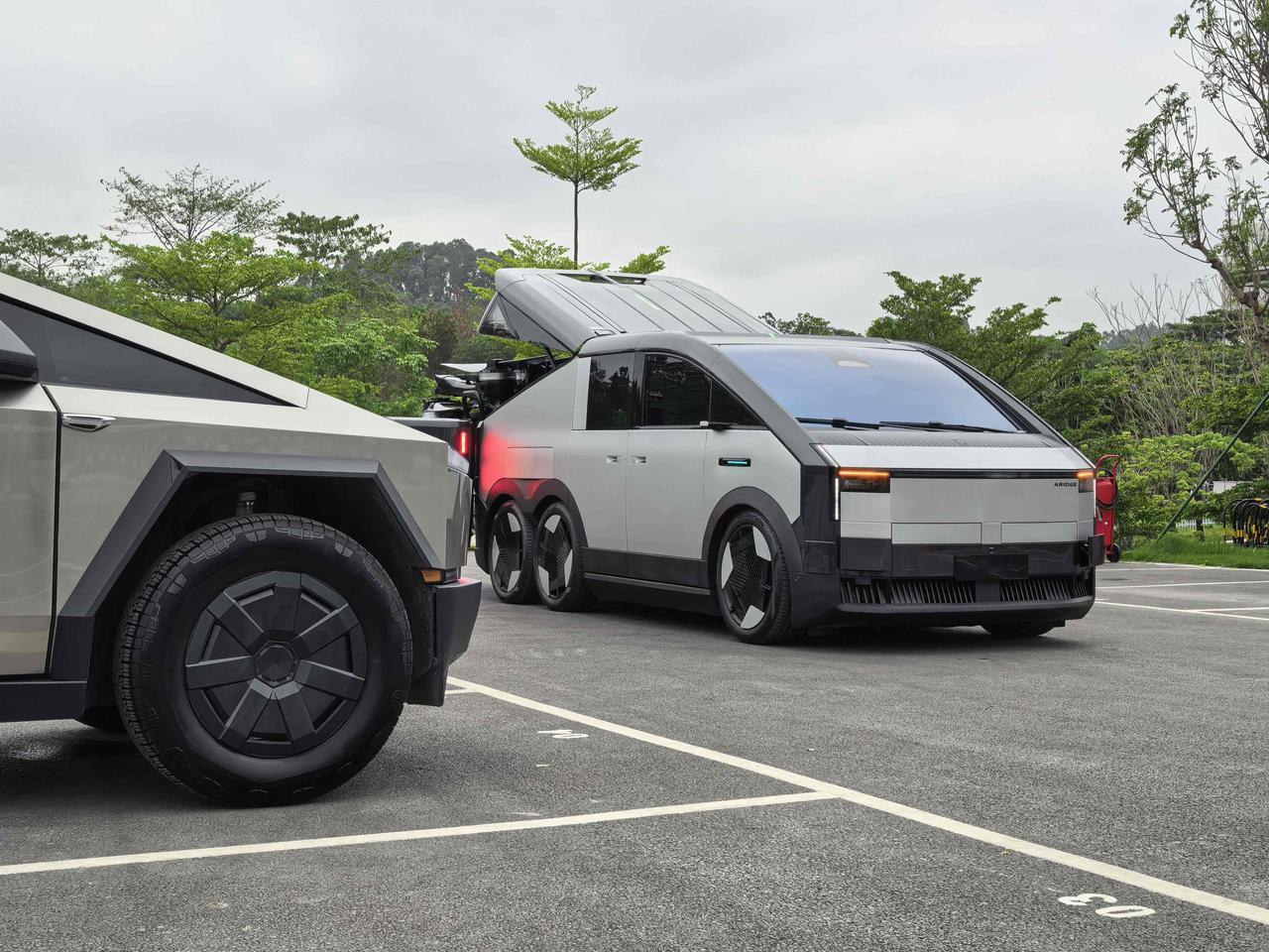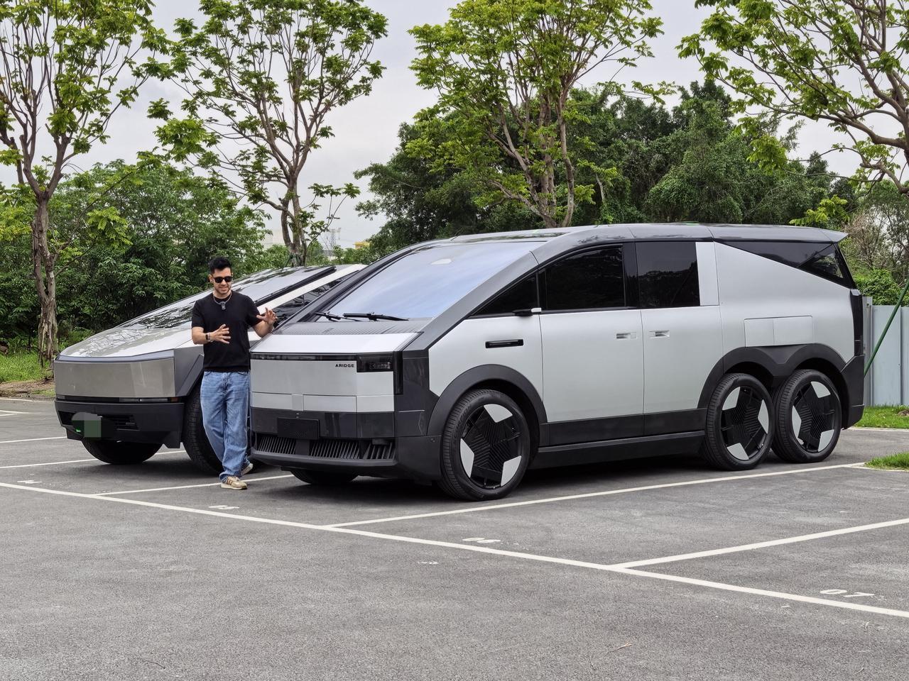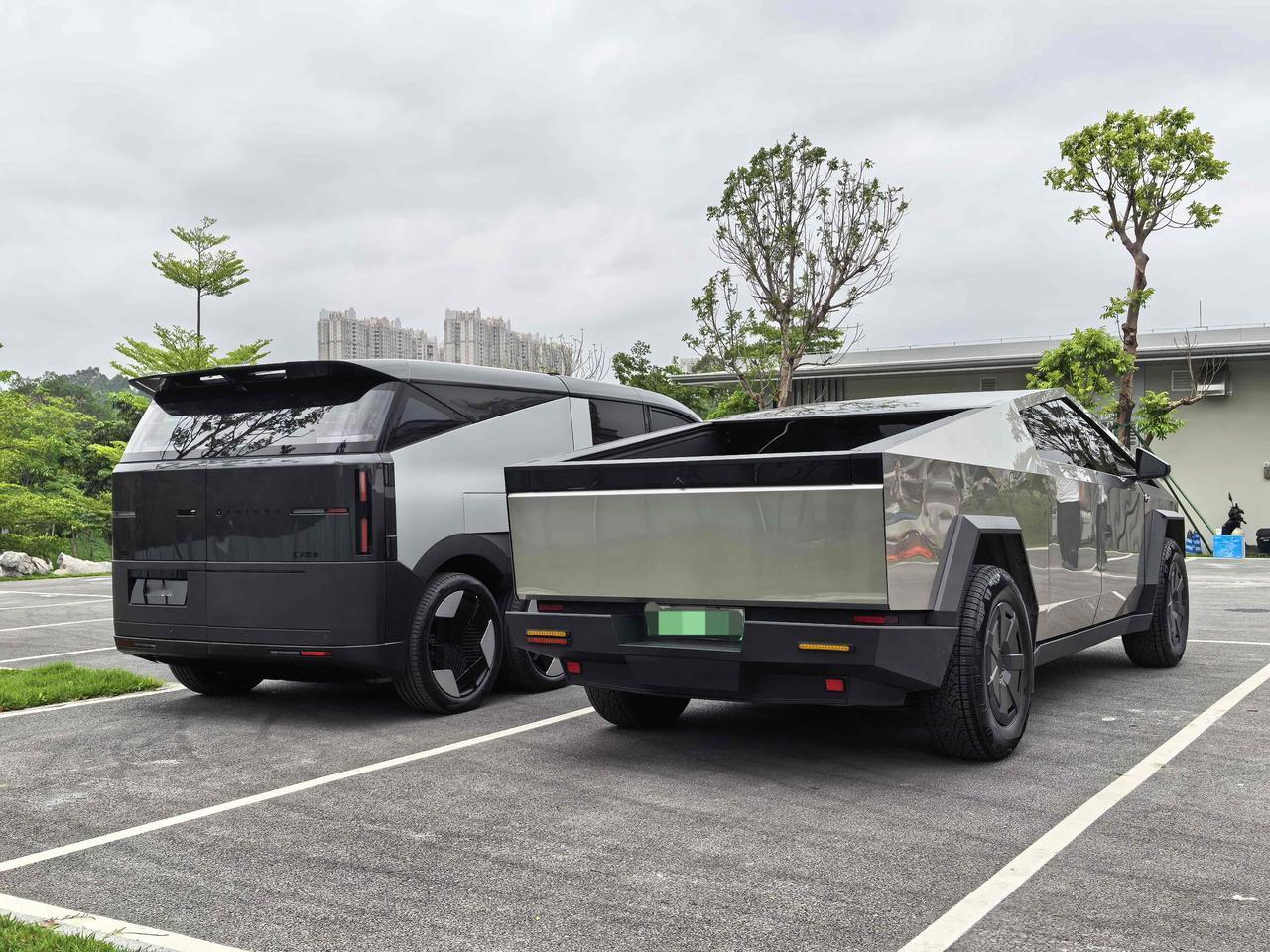 没想到,路过一个停车场偶遇到汇天的陆地航母,旁边还有一辆Cybertruck,问了几句原来是Cybertruck车主过来小鹏这边,顺便让两台原创科技十足的车同框,帅啊。