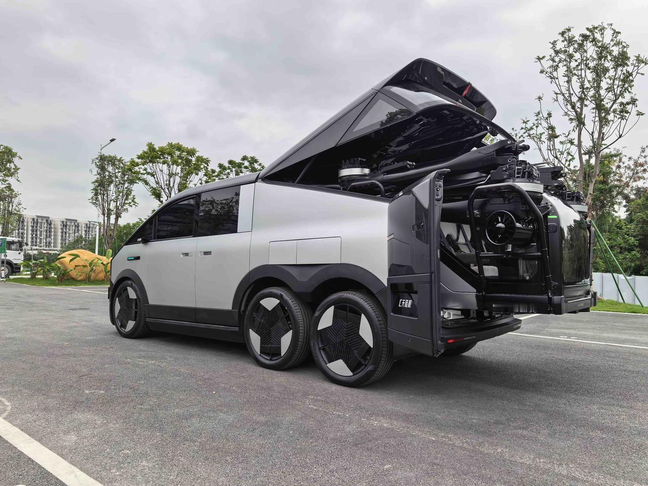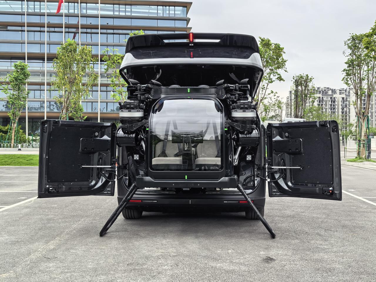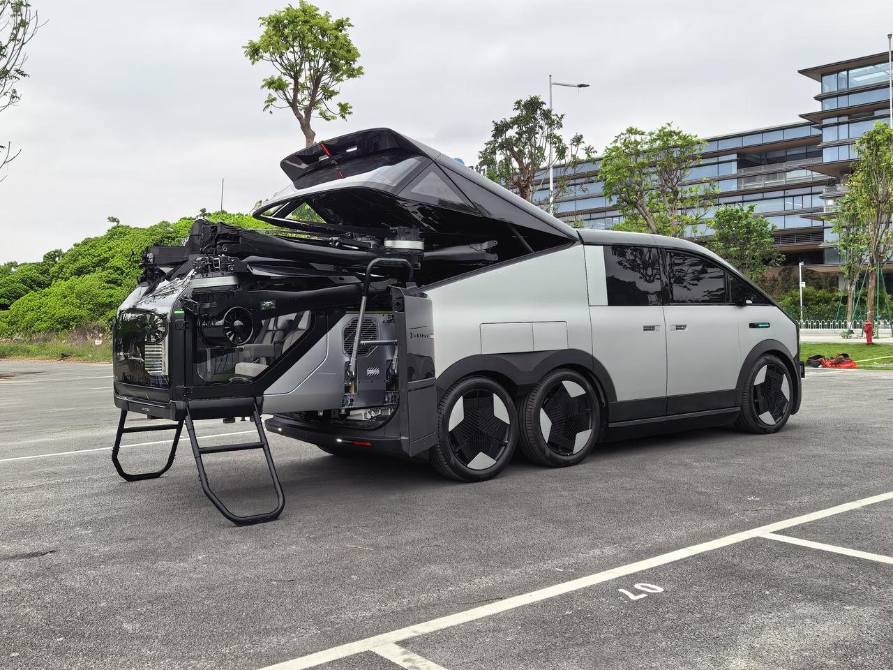 不过,这两辆是完全不同的路线,Cybertruck是越野车,主打一个任何一种路况都可以,而陆地航母可以说中国原创的科幻大作,3轴6轮6驱、5546mm车长,悬浮双色车身,最绝的是分体式飞行汽车设计,尾舱能藏飞机,自动分离结合,解决存放补能难题。未来某一天,开着陆地航母到各地,一键放出汇天飞行器,开着飞机看着我们的大好河山,真的又美又酷。