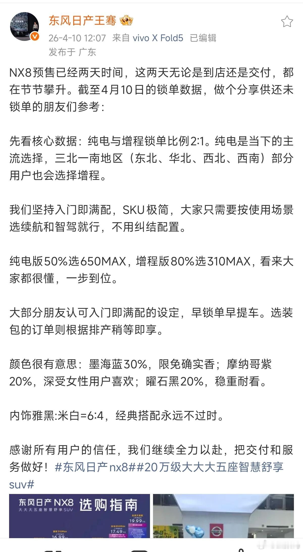 据骞总数据分享,东风日产NX8,纯电还是更香饽饽,纯电与增程锁单比例2:1。 而且,纯电版50%选650MAX,增程版80%选310MAX。
