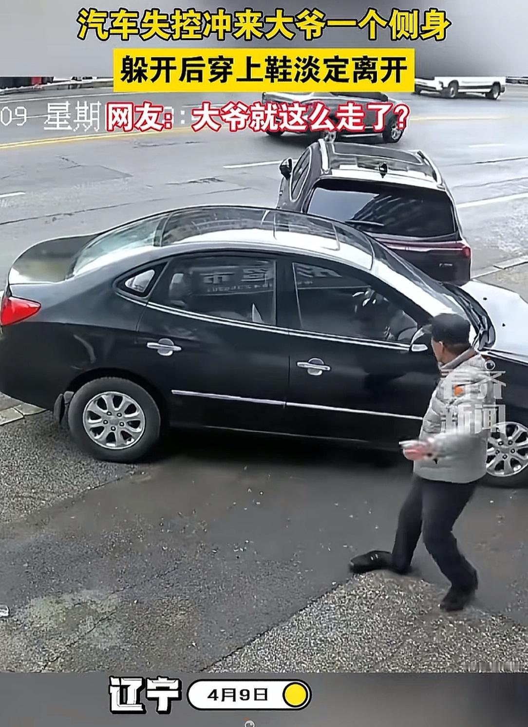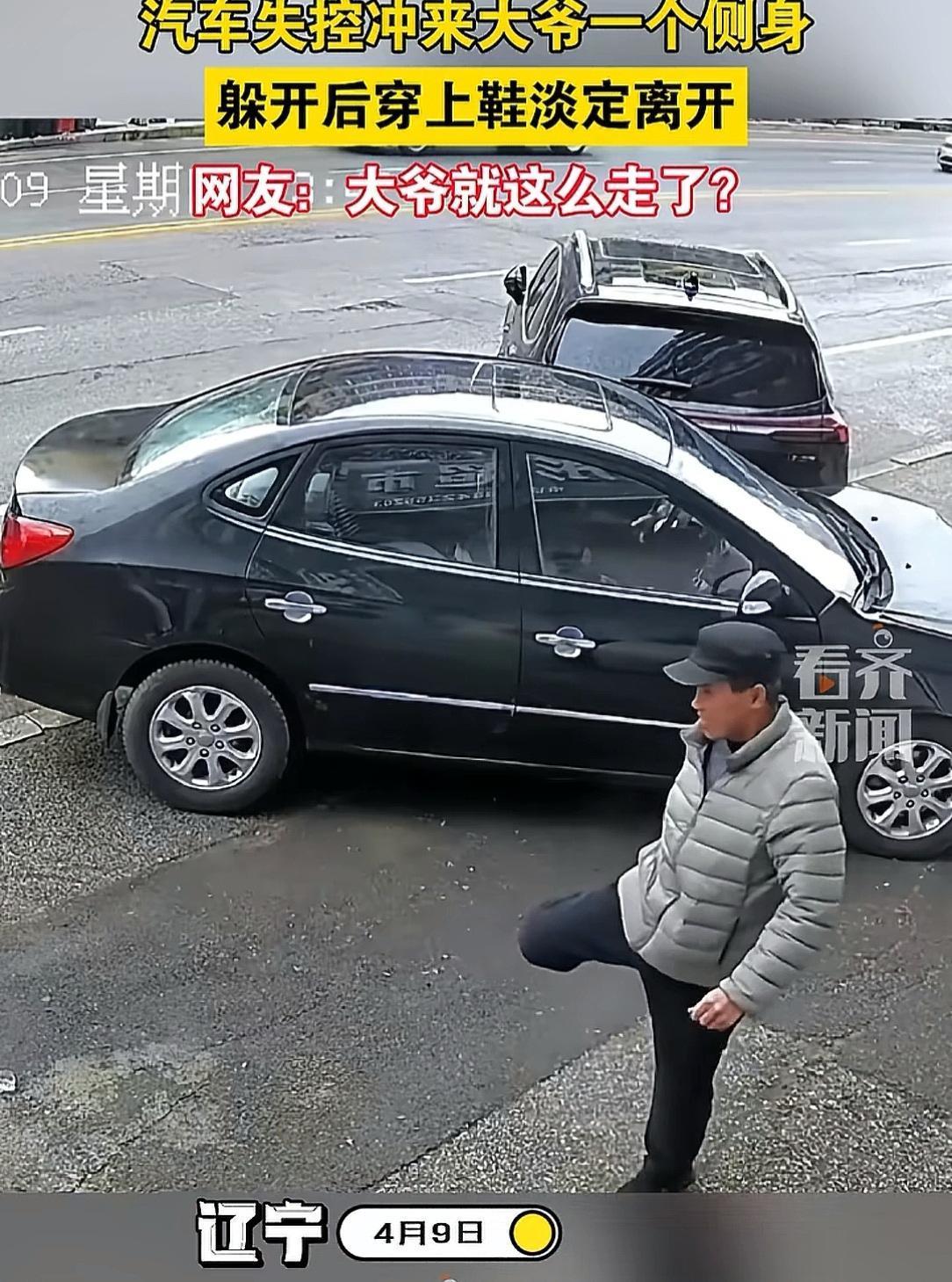 大爷被撞后,一声没坑看了几眼车子,把自己被撞掉的鞋子穿起来扭了扭自己的脚就走了