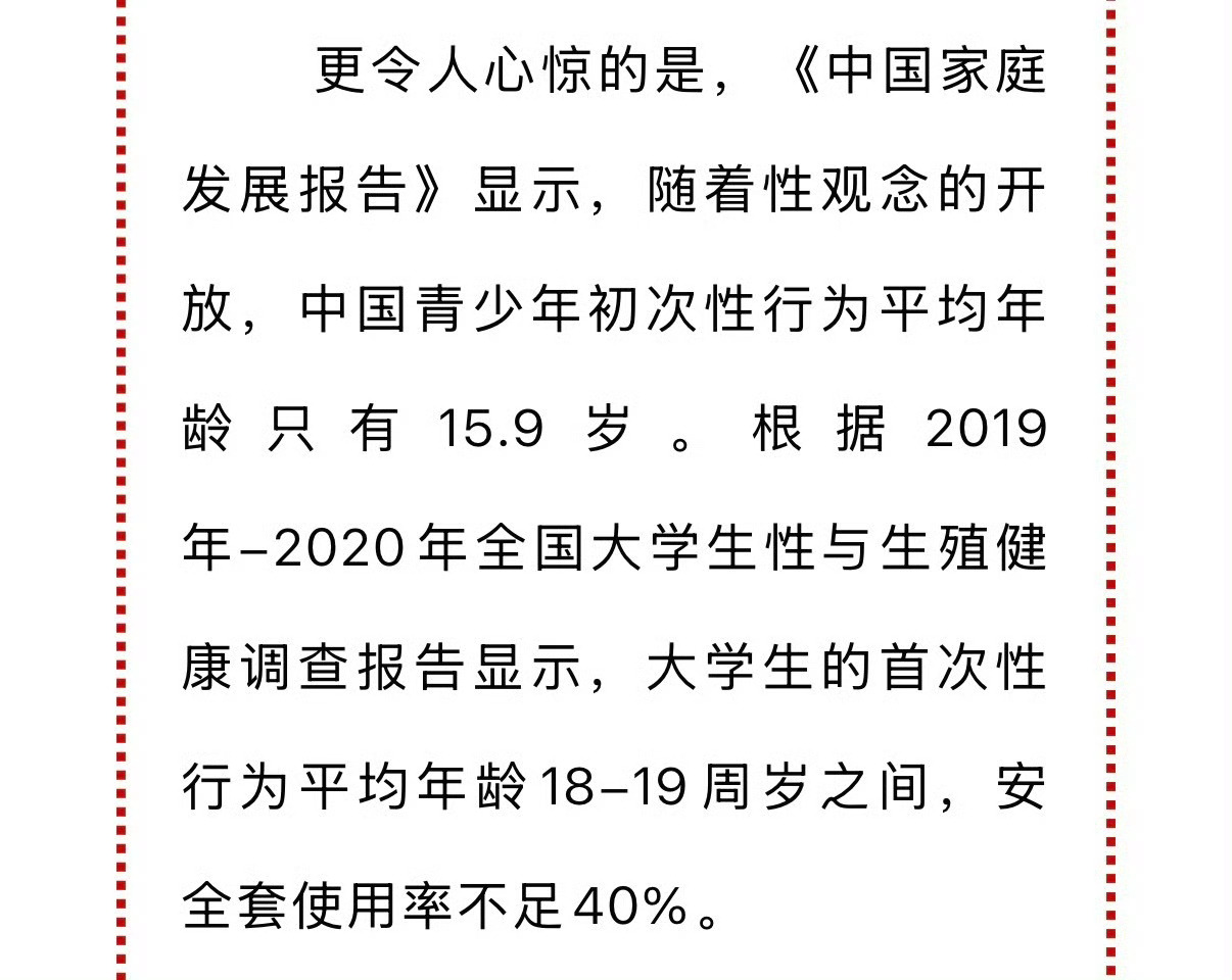 据公开可查的权威数据,2015年全国性调查就显示,15-17岁青少年性行为发生率为4.1%,初次性行为平均年龄低至15.9岁;2019-2020年全国大学生性与生殖健康调查显示,大学生首次性行为平均年龄19.3岁,其中30%的大学生初次性行为发生在18岁之前,这就意味着,有相当一部分人的第一次,就发生在初中、高中阶段。